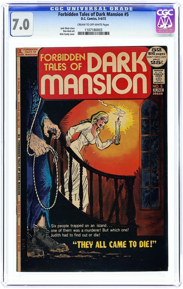 With this issue the title changes from "The Dark Mansion of Forbidden Love" to "Forbidden Tales of Dark Mansion." This issue, a double size comic, features a book-length, five-part story with chapter titles "They All Came to Die," "Death Plays Host," "Murder Strikes Again," "Search for a Killer," and "An End to Madness." In this 36-page story (Script by Jack Oleck & Art by Don Heck), six people are trapped on a island and one is stalking and trying to kill the rest of them, 52 pages. Cover price $0.25.