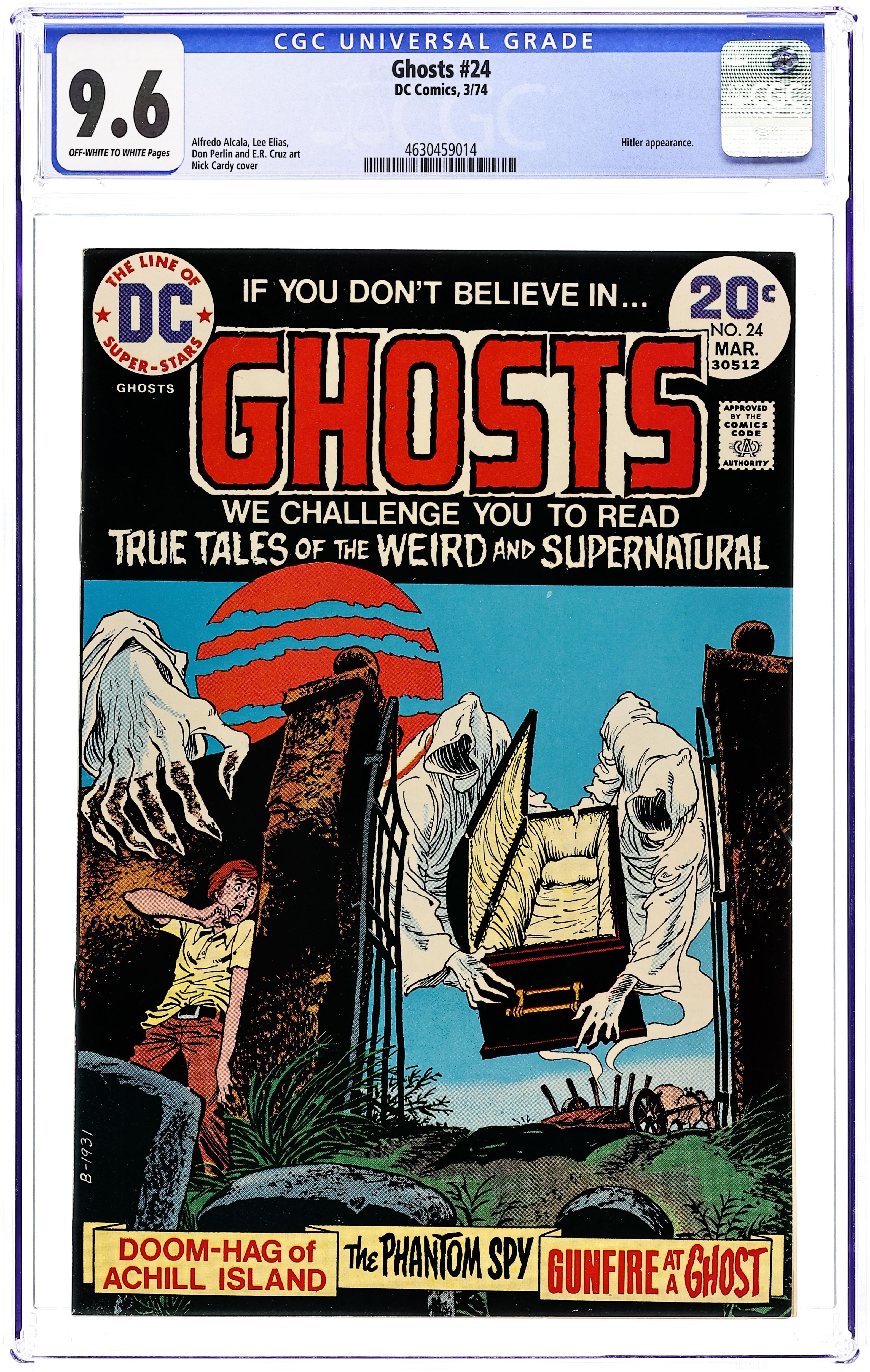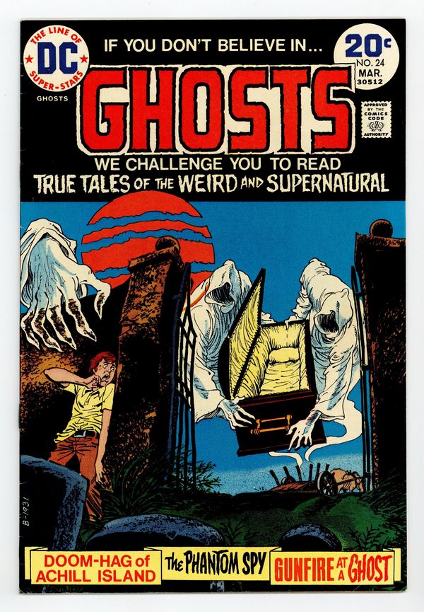 $29.50Cover by Nick Cardy. Stories by unknown. Art by Alfredo Alcala, Lee Elias, Don Perlin and E.R. Cruz. If you don't believe in ghosts...we challenge you to read true tales of the weird and supernatural! In this issue: "You, Too, Will Die!" with art by Alfredo Alcala; "The Phantom Spy!" with art by Lee Elias; Tales of the Haunted and the Damned! story "Dark Was the Pit" with art by Don Perlin; "Doom-Hag of Achill Island" with art by E.R. Cruz; and 1-page text story "Gunfire at a Ghost"! 32 pages, full color. Cover price $0.20.