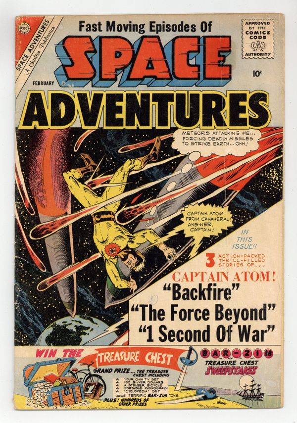 Cover art by Steve Ditko. "One Second Of War," script by Joe Gill, art by Steve Ditko; Captain Atom must stop Dr. Claudius Jaynes from firing nuclear missiles at all the big cities on Earth. "Backfire," script by Joe Gill, art by Steve Ditko; Captain Atom must stop the missles launched at the U.S. by Gustav Borlin and Dr. Skafic. "Common Denominator," pencils by Bill Molno, inks by Vince Alascia. "Martians, I Greet You!" text story. "The Force Beyond," script by Joe Gill, art by Steve Ditko; Captain Atom must stop an alien warship trying to start a nuclear war on Earth. 36 pgs., full color. Cover price $0.10.