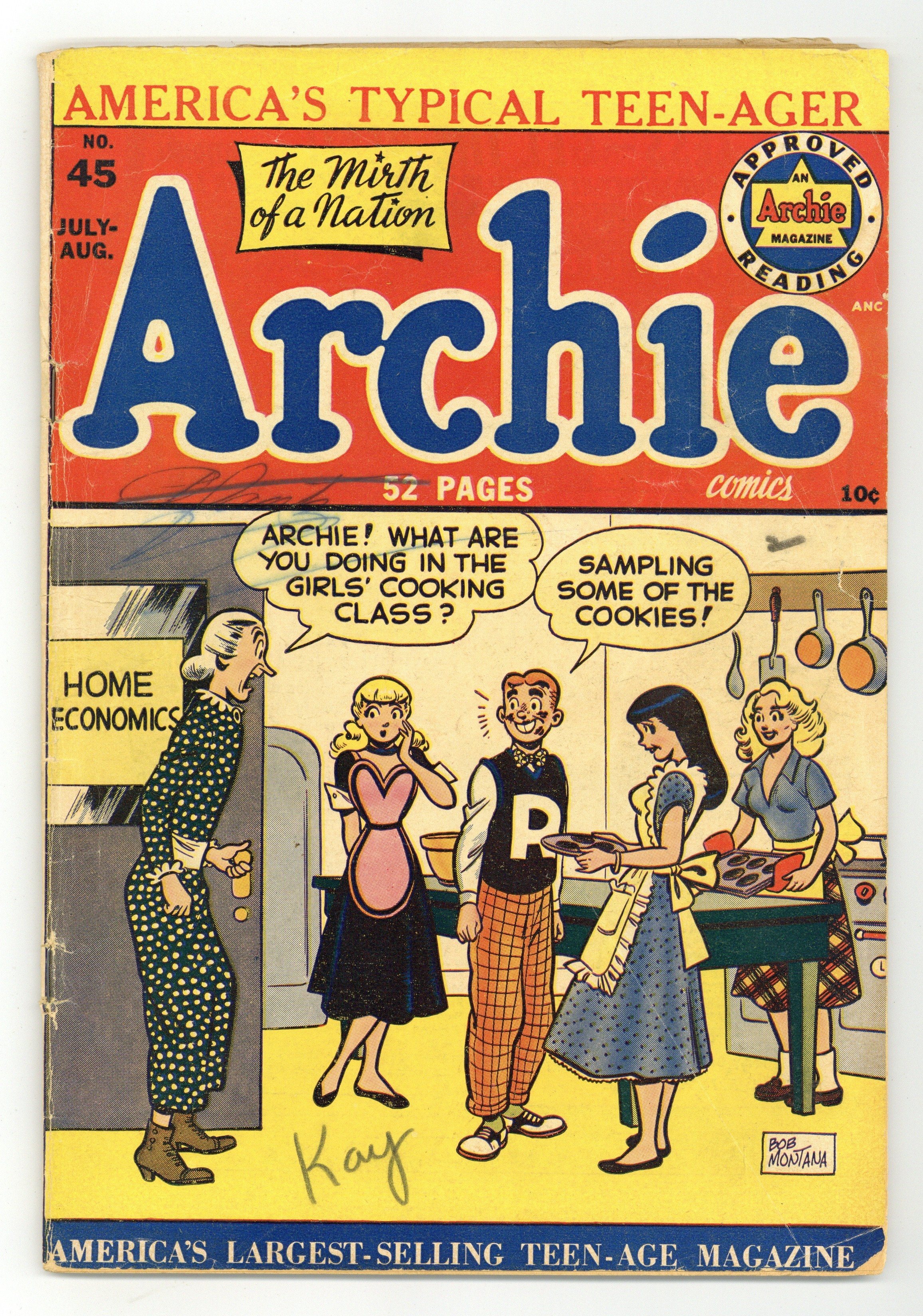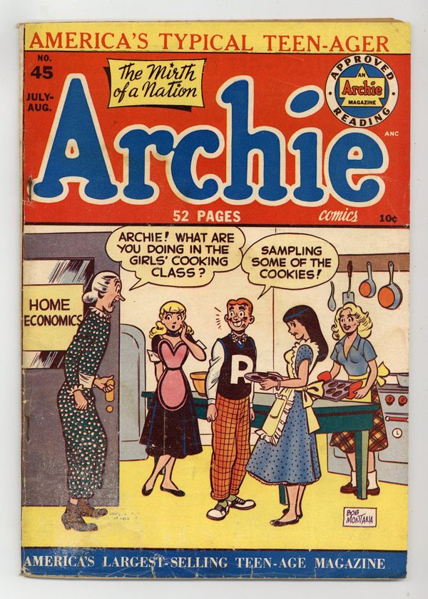 Cover by Bob Montana. Stories by unknown. Art by Sam Schwartz, Bill Vigoda?, George Frese? and unknown. Featuring Archie in: "Scrambled Canastas"; "Southern Fried Archie"; "The Glad Plaid"; "Date Bait"; and "The Red White and Blue Blood"! Plus: Jughead in "The Quiz Kid" (plug for WILBUR COMICS)! Also: 2-page "Hollywood Tattle Tales"! Full color. Cover price $0.10.