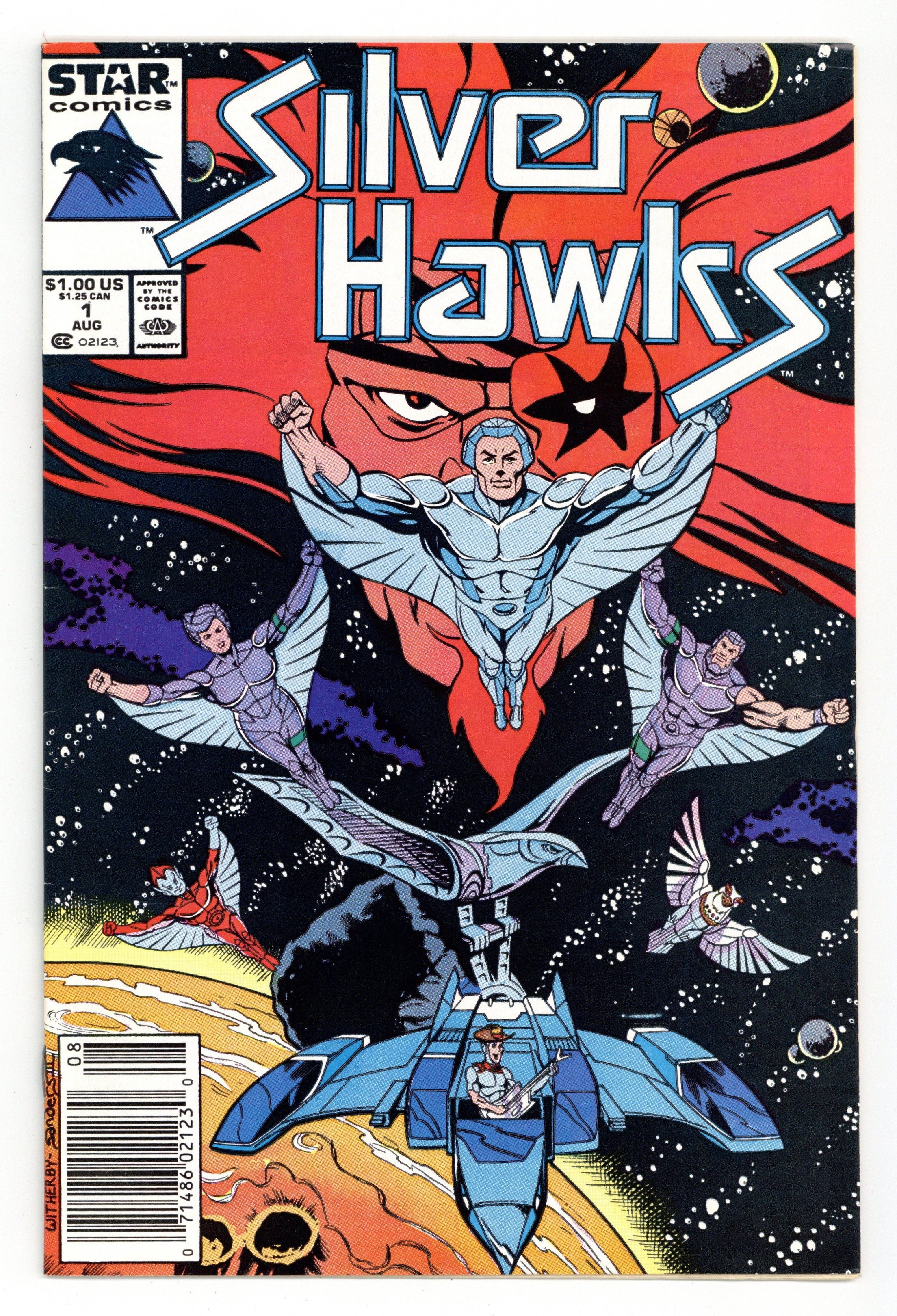 Comic book based on the TV series of the first super androids with the minds of men and the muscles of machines. The evil Mon-Star has escaped from the prison planet, reunited with his mob of evil doers and the galaxy is in trouble. So Commander Stargazer calls Earth for help and Earth sends their new team, the SilverHawks, which consists of Quicksilver, the Copper Kid, Bluegrass, Steelheart and Steelwill, to battle Mon-Star and his gang in "The Origin Story." Script by Steve Perry and art by Mike Witherby & Jim Sanders III. Cover price $1.00.