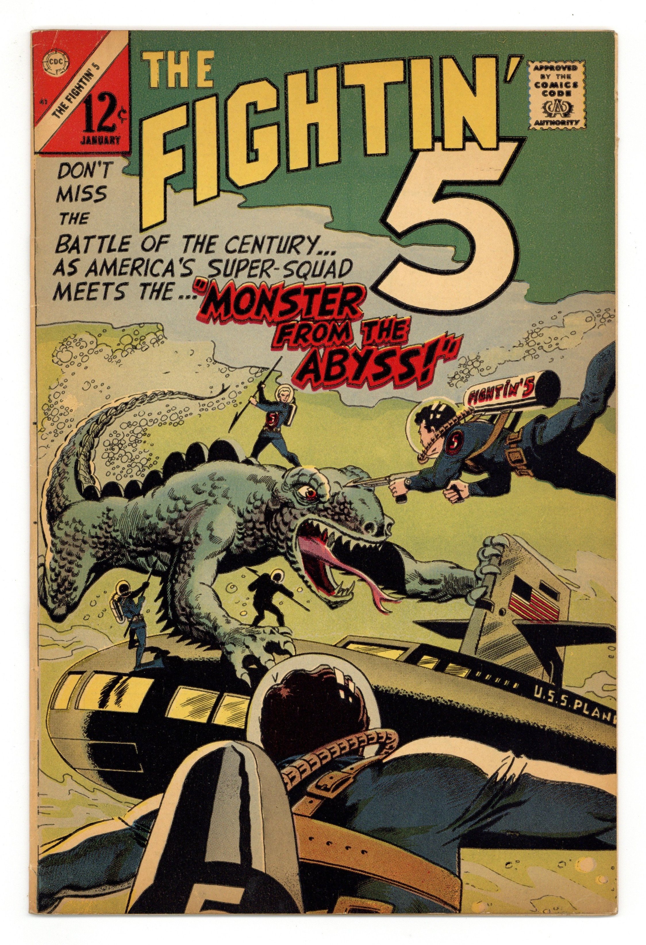 Cover by Rocco "Rocke" Mastroserio. Stories and art by Pat Boyette, Bill Montes, Ernie Bache, and Joe Gill. Five tough guys form a specialized combat unit for specialized missions. The five battle a monster that strongly resembles Charlton monster Gorgo. But the real enemy is Dr. Aquilla, who is secretly on the monster's side. In the backup story, the Peacemaker tracks warmonger Emil Bork, who sets nations at war with each other and then profits from the results. Monster From the Abyss; Expendable Except; Peacemaker: The War Peddler. Final issue of the original run; the series was revived 14 years later. 32 pages, Full Color. Cover price $0.12.