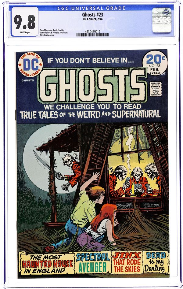 Cover by Nick Cardy. Stories by Carl Wessler and unknown. Art by Fred Carrillo, Gerry Talaoc, J. Noriega, Sam Glanzman and Alfredo Alcala. If you don't believe in ghosts...we challenge you to read true tales of the weird and supernatural! In this issue: "Dead Is My Darling!" with art by Fred Carrillo; "The Spectral Avenger" with art by Gerry Talaoc; Tales of the Haunted and the Damned! story "The Most Haunted House in England!" by Carl Wessler, J. Noriega and Alfredo Alcala; "The Jinx That Rode the Skies" with art by Sam Glanzman; and 1-page text story "Our Son, the Spectre"! 32 pages, full color. Cover price $0.20.