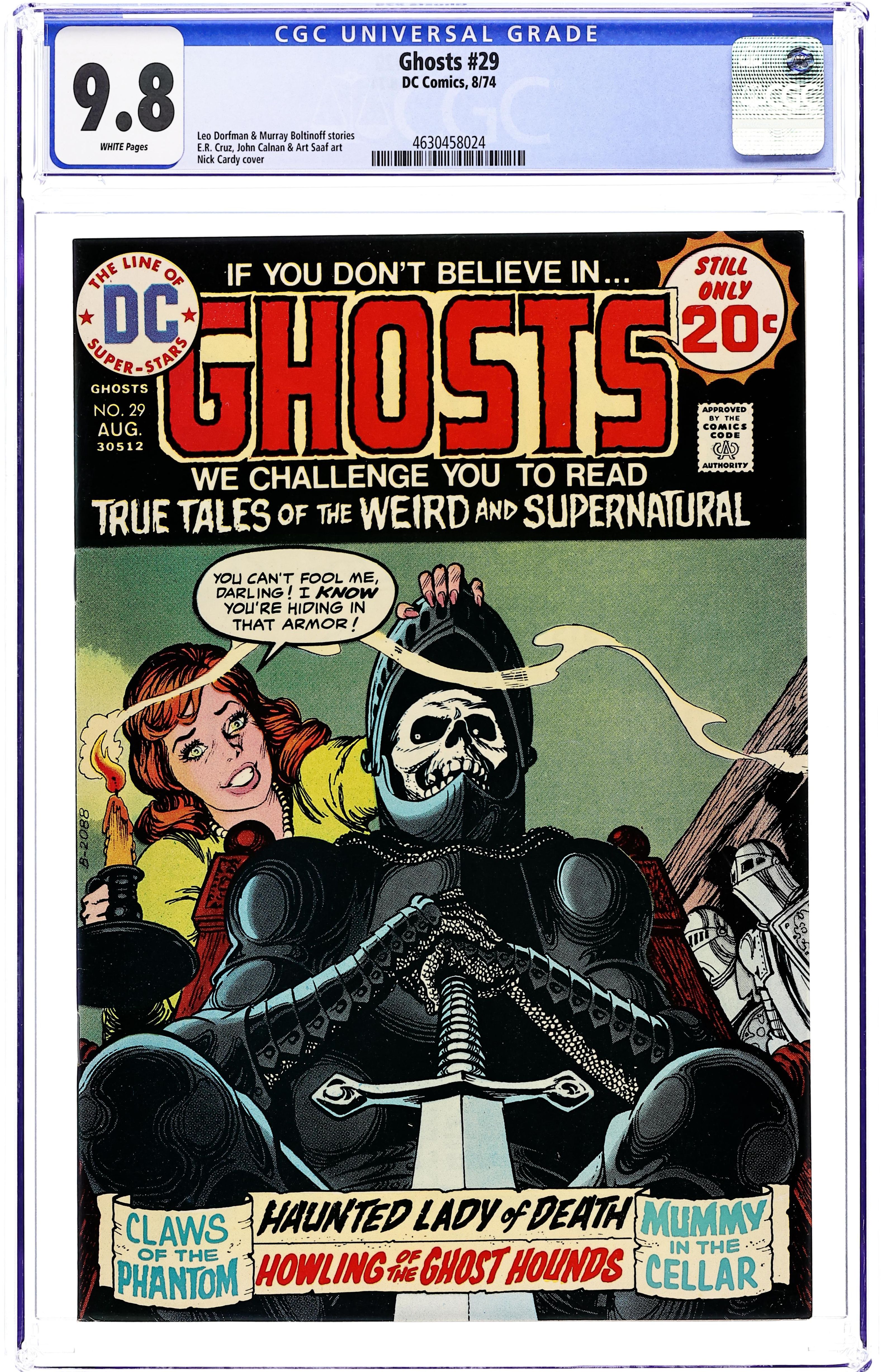 Cover by Nick Cardy. Stories by Murray Boltinoff and Leo Dorfman. Art by E.R. Cruz, Art Saaf and John Calnan. If you don't believe in ghosts...we challenge you to read true tales of the weird and supernatural! In this issue: "The Haunted Lady of Death" by Murray Boltinoff and E.R. Cruz; "Howling of the Ghost Hounds!" by Leo Dorfman and Art Saaf; "The Claws of the Phantom" by Leo Dorfman and John Calnan; 1-page text story "Mummy in the Cellar" (writer unknown); and James Cagney and Olivia De Havilland in Hollywood Hauntings 2-pager "When Stars Met Specters" by Murray Boltinoff and John Calnan. 32 pages, full color. Cover price $0.20.