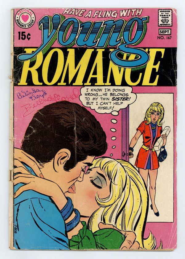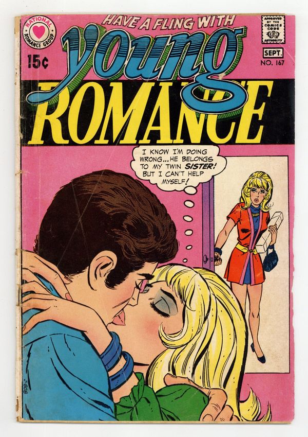 Cover pencils by Bill Draut. Stories by Robert Kanigher and Jack Miller. Art by Win Mortimer, Tony DeZuniga, Werner Roth and Vince Colletta. She knows she's doing wrong -- he belongs to her twin sister! But she can't help herself! Featuring: "The Stolen Face of Love! Part One" (continues next issue); "A Million Laughs in Every Kiss"; and "I Can Dream, Can't I?" Plus: Laura Penn...Your Romance Reporter letters page. 32 pages, full color. Cover price $0.15.