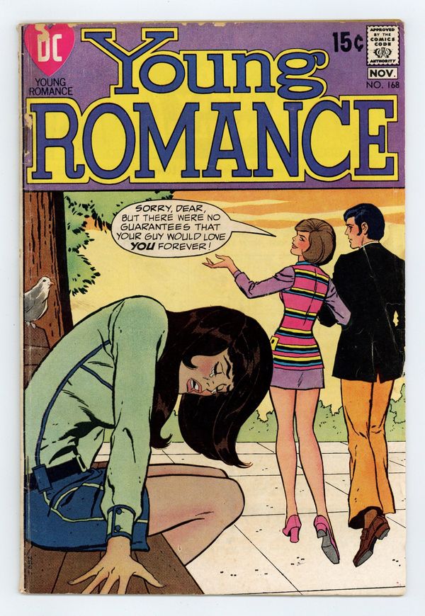 Cover by Bill Draut. Stories by Jack Miller, Robert Kanigher and unknown. Art by Don Heck, Win Mortimer, Bill Draut, Elizabeth Berube, Lee Elias and Vince Colletta. She didn't realize...that there would be no guarantees her guy would love her forever! Read..."Love Me, Love Me Not"! Also featuring "The Stolen Face of Love, Part Two" (continued from last issue). Plus: Reprint story "A Smile for Someone"! And: 1-page Dates 'n' Mates fashion feature; 1-page "Hang-Ups" article written by Henry Boltinoff; and Laura Penn...Your Romance Reporter letters page. 32 pages, full color. Cover price $0.15.