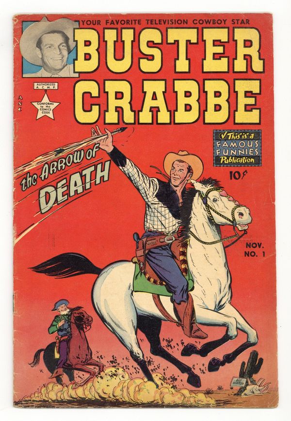 Cover by Bill Walton. Art by Frank Frazetta and Max Elkan. Adventure tales featuring Hollywood legend Buster Crabbe, star of Flash Gordon, Buck Rogers and Tarzan serials. A profile of Buster Crabbe, who was an Olympic athlete before becoming an actor; Buster and Whiskers track a killer into the Colorado mountains and find foreign agents making atomic weapons; A classic PSA featuring early art by fantasy and comics legend Frank Frazetta. Buster Crabbe; Mysterious Mountain; Whiskers Rides Again; The Guns That Won the West; The Branding Iron; The Arrow of Death; The Sinister Cargo; Billy the Kid - a True Story of the Old West; We Can Stop the Enemies of Youth. 32 pages, Full Color. Cover price $0.10.