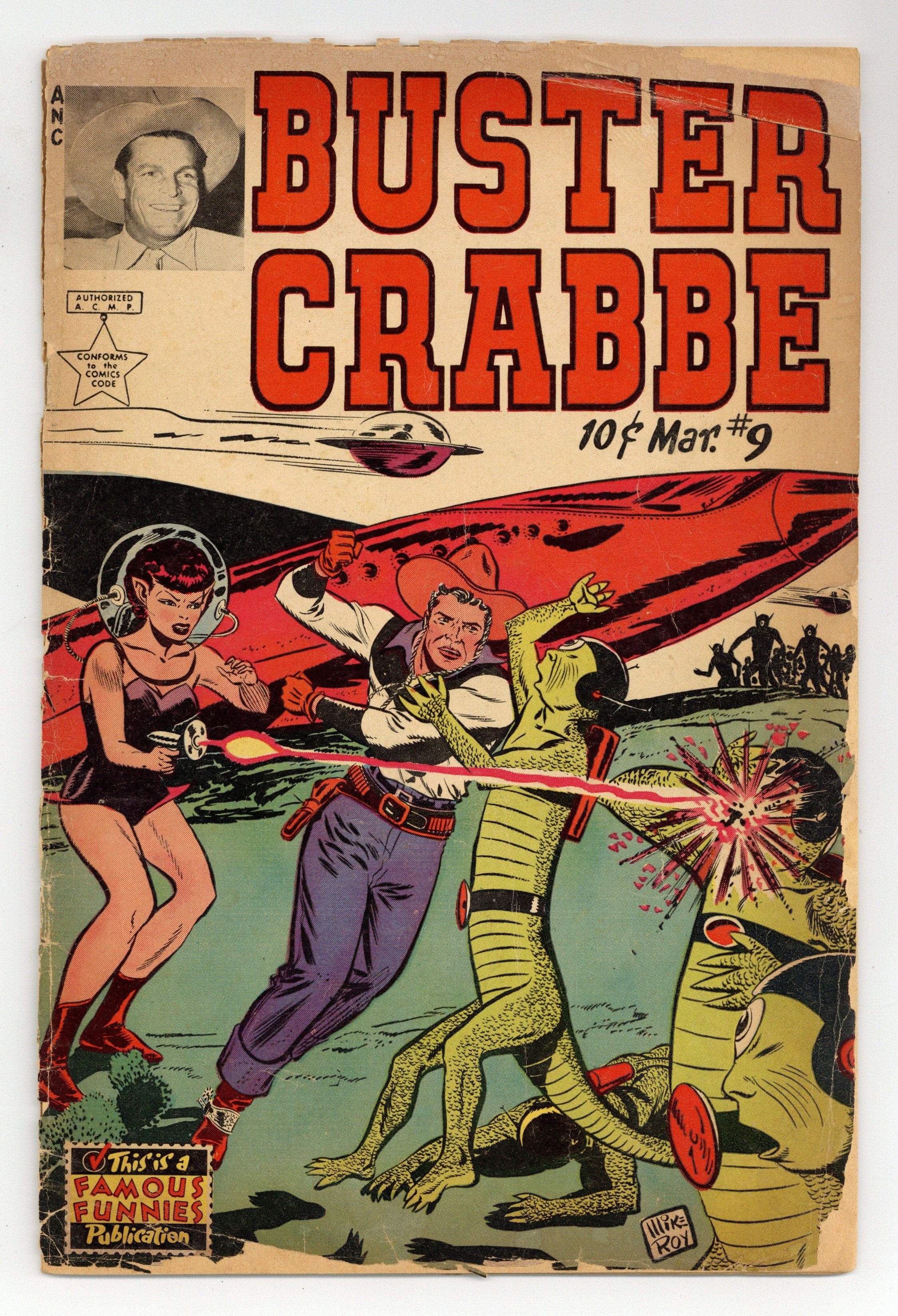 Cover by Mike Roy. Stories and art by Mike Roy, Jack Farr and Frank Frazetta. Adventure tales featuring Hollywood legend Buster Crabbe, star of Flash Gordon, Buck Rogers and Tarzan serials. Buster and Whiskers are taken captive by aliens, but luckily, gorgeous alien gal Zina is on their side. An article about Buster Crabbe's famous movie serials. A classic Boy Scouts PSA featuring early art by fantasy and comics legend Frank Frazetta. Hank the Hero; Invaders from Beyond; March is Red Cross Time, Answer the Call; The Big Fight; Homer on the Range; Buster in Reel Action; Whiskers and the Terrible Tee-Nee-Wee-Nees; Half Pint Pinto; Boy Scouts of America National Jamboree 1953. 32 pages, Full Color. Cover price $0.10.