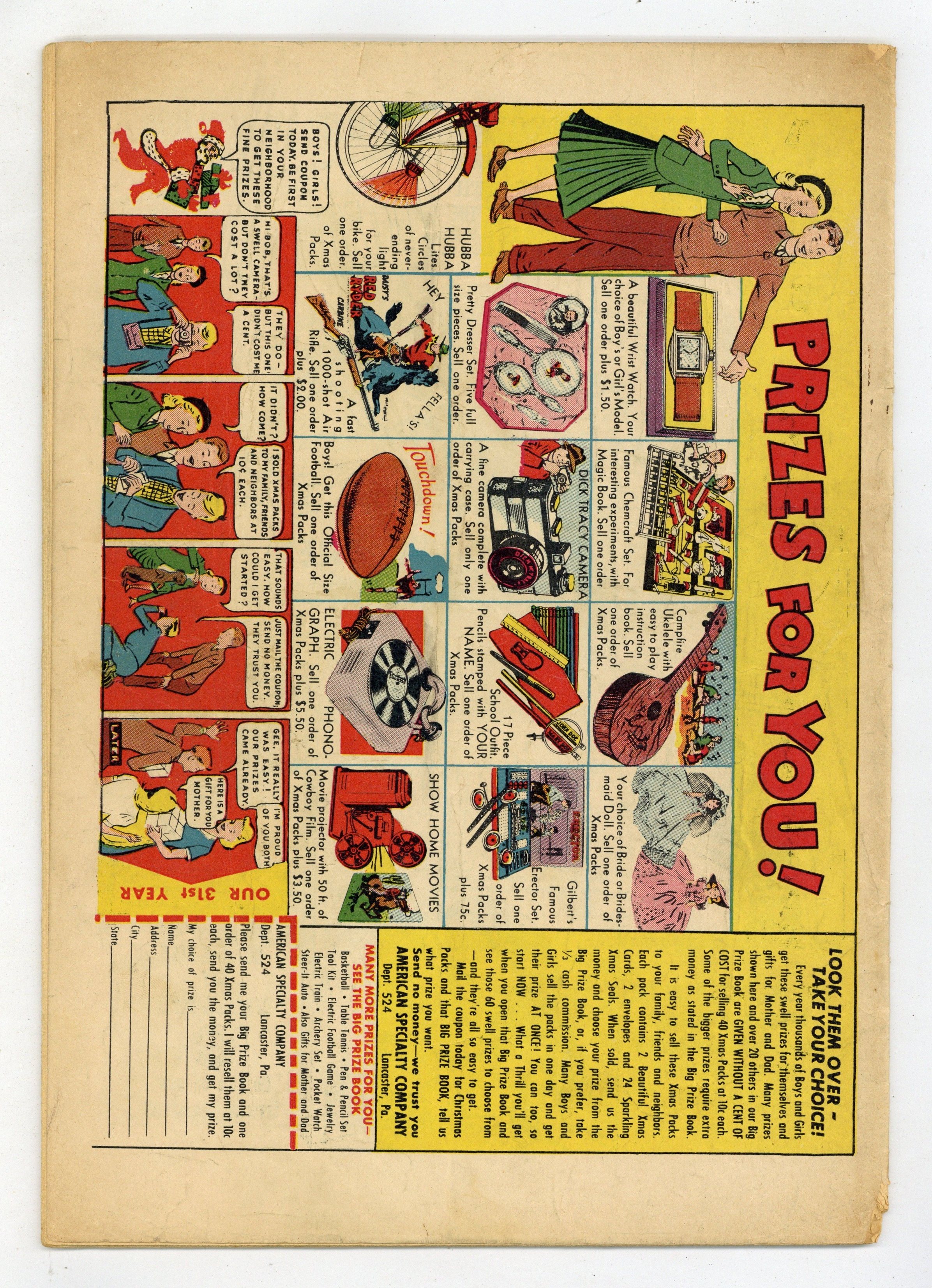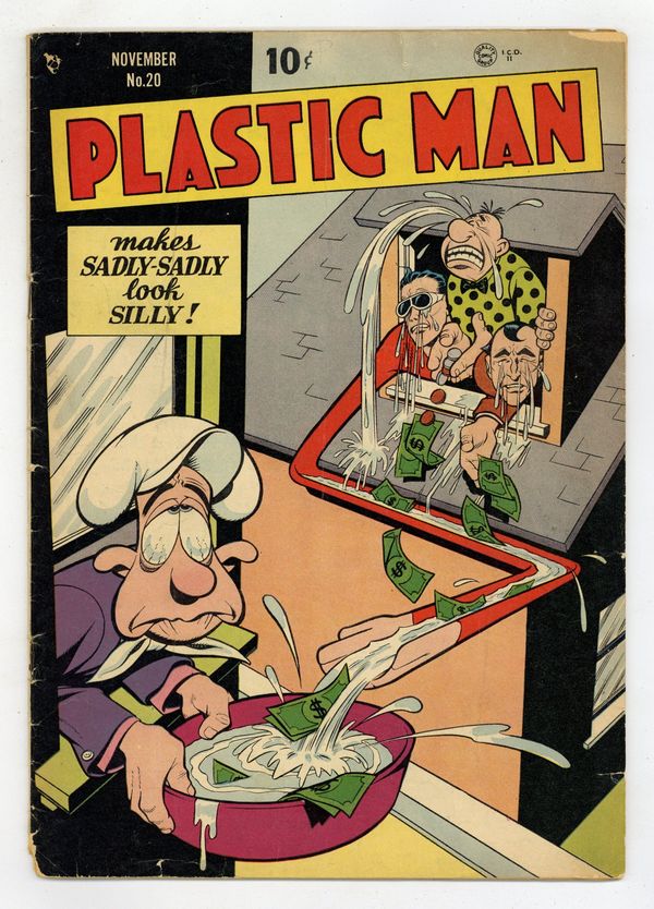 Cover art by Jack Cole. Sadly-Sadly, script by Joe Millard, art by Jack Cole; Sadly-Sadly Sanders had a face so pitiful that looking upon him induced uncontrollable sobbing, and he used this ability to commit robberies...until Plastic Man got him to laugh! Is Yours a Captivating Personality?, art by Jack Cole. Mr. Blobb Goes To Town text story with Plastic Man. Come To the Oriental Quarter starring Plastic Man, art by Jack Cole. 36 pgs. $0.10. Cover price $0.10.