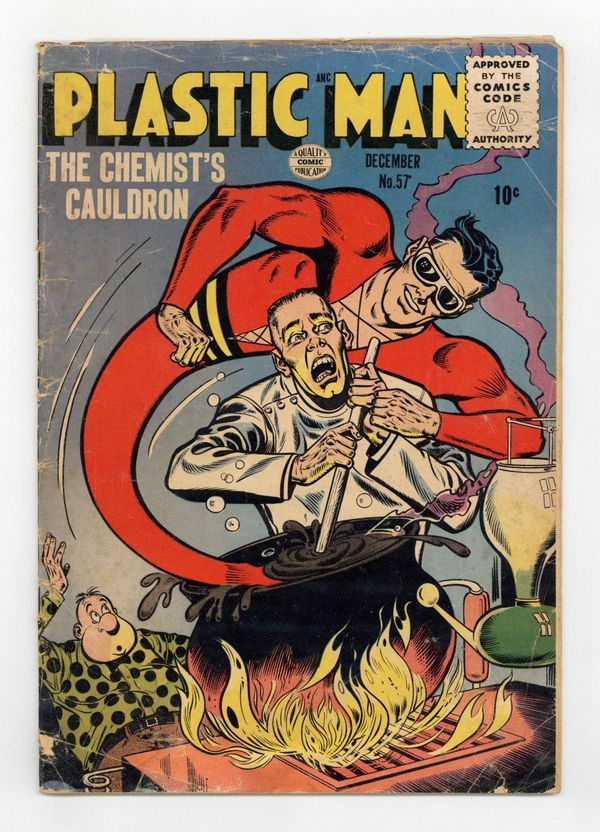 Plastic Man stars in "The Chemist's Cauldron," "A Photo Finish," and an untitled story. Untitled Woozy back-up story. Jack Cole cover and art? Cover price $0.10.
