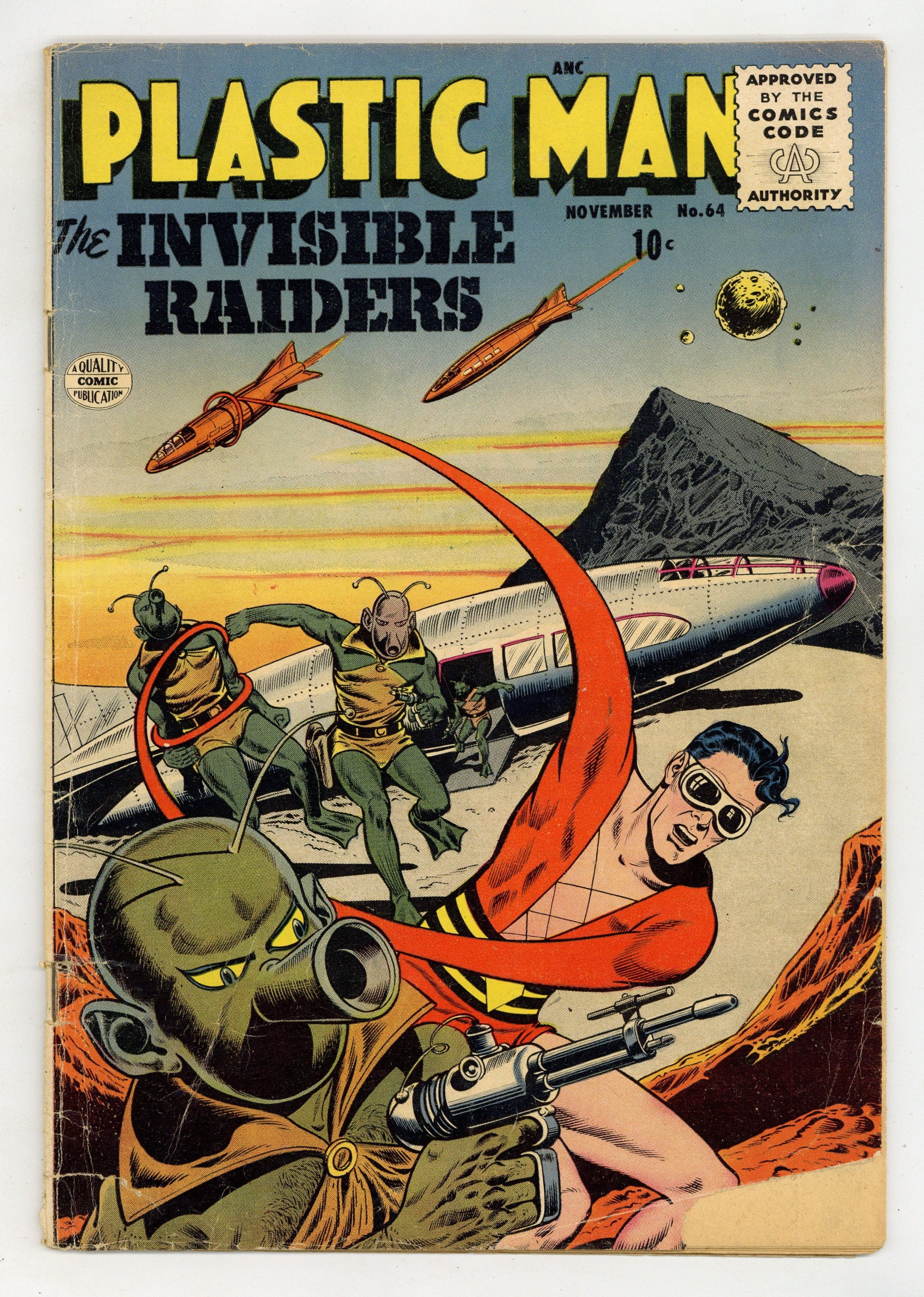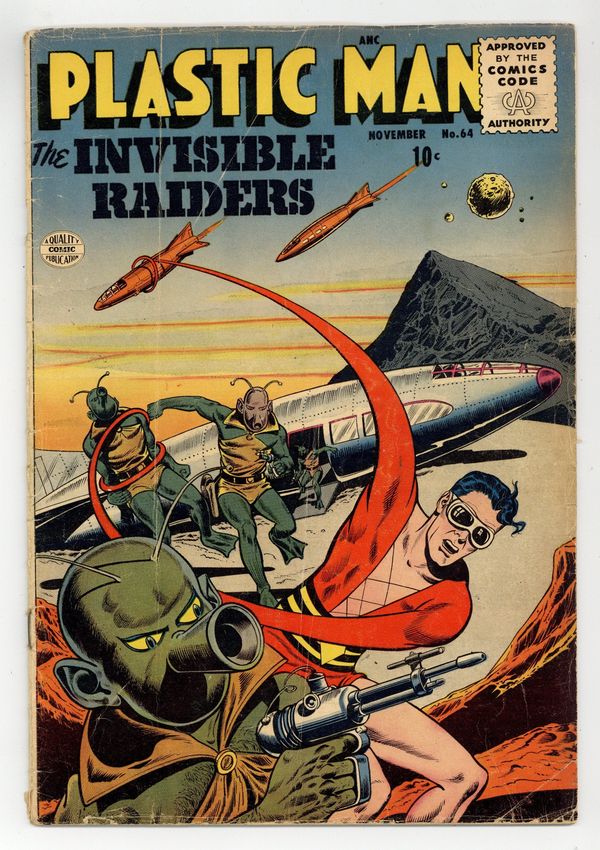 Final issue of the series. Plastic Man in "The Expander Device," "The Invisible Invaders," and an untitled story. Woozy back-up. Cover price $0.10.
