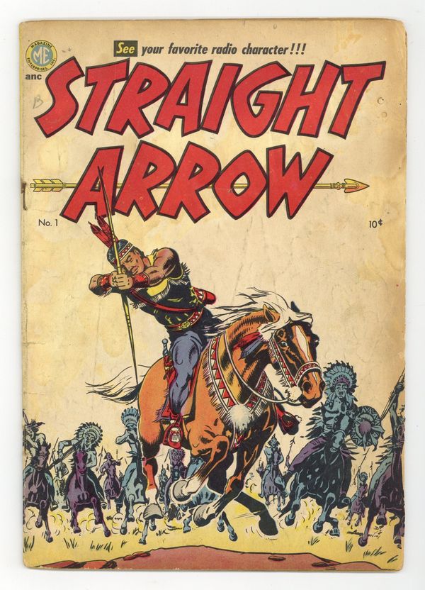 Stories by Gardner Fox and others. Art by Bob Powell, Fred Meagher and Ogden Whitney. Cover by Fred Meagher. Rancher Steve Adams, a Comanche raised by white settlers, has a secret identity as the warrior Straight Arrow, a hero who first appeared on a popular radio show. Straight Arrow must prevent a racist cavalry colonel from starting a war with the Kiowa; The tale of White Comanche is based on the real-life story of Quanah Parker and his mother, Cynthia Ann Parker; Apaches abduct a rancher couple and demand a ransom. Plus non-fiction features on horses and lodge poles. Indian Horse Recognition; Straight Arrow!; Lodge Pole Lore; Roaring River; White Comanche; Timmy Takes the Trail; Apache Vengeance; Archery. 32 pages, Full Color. Cover price $0.10.