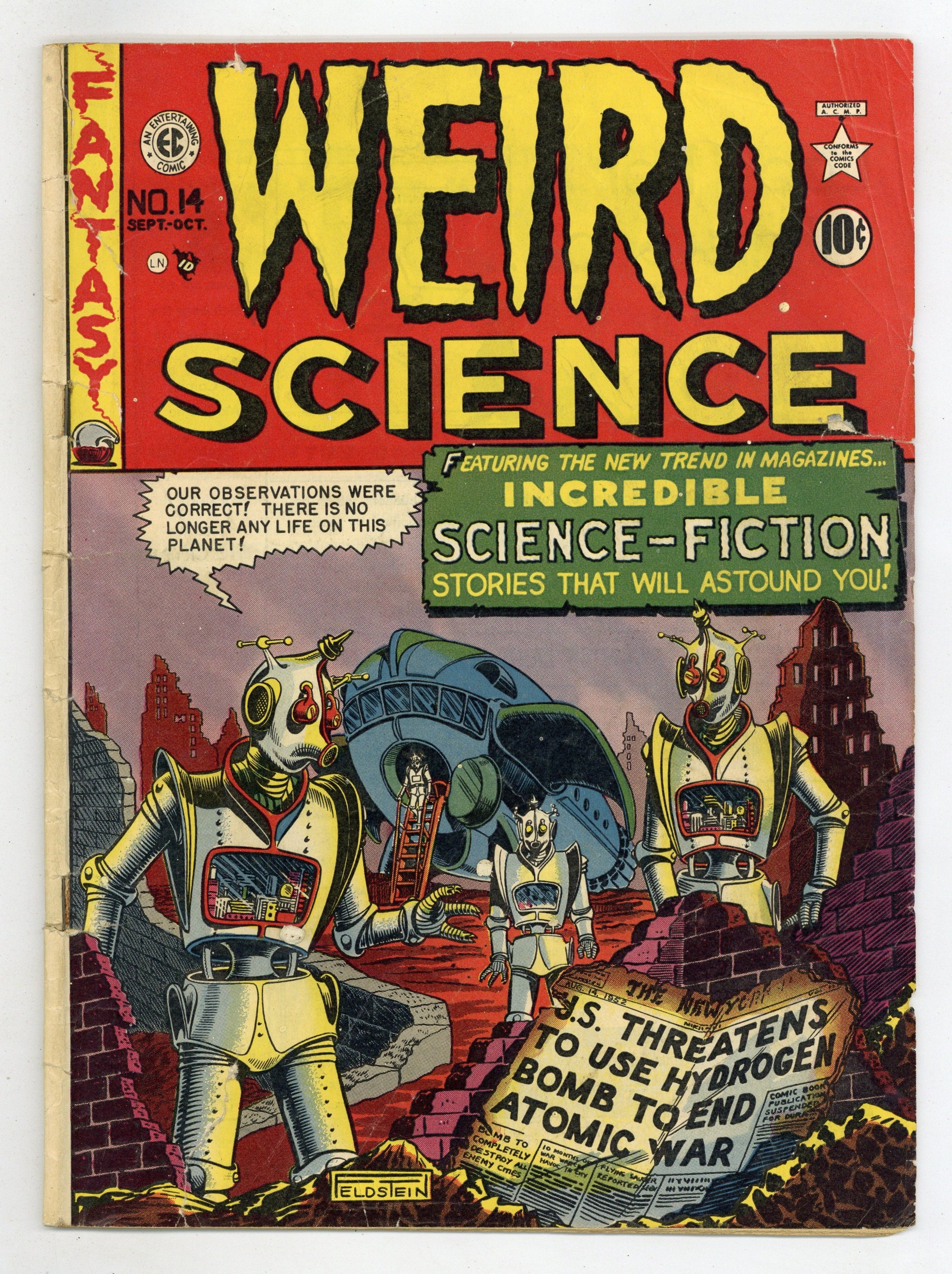 Cover by Al Feldstein. Stories by Roald Dahl, Harvey Kurtzman, Bill Gaines and Al Feldstein. Art by Harvey Kurtzman, Jack Kamen, Harry Harrison, Wally Wood and Al Feldstein. NOTE: There are two issues in this series numbered 14. The issue pictured here, dated Sept/Oct 1950, although numbered 14, is the actual # 3 in the series. The one dated Sept/Oct 1952 is issue # 14 in the series. EC's influential New Trend title featured some legendary sci-fi and comics artists. A scientist learns that trees and plants can, in fact, scream, and gains a new perspective on yardwork in a Harvey Kurtzman story. An inventor's latest creation comes to him in a dream, with art by Harry Harrison and Wally Wood. Professor Holman tries to warn Earth's leaders that their latest bomb test will destroy the planet. Classic alien robots/A-bomb cover by Al Feldstein. Destruction of the Earth!; The Sounds From Another World!; Machine From Nowhere; The Eternal Man. 36 pages, Full Color. Cover price $0.10.