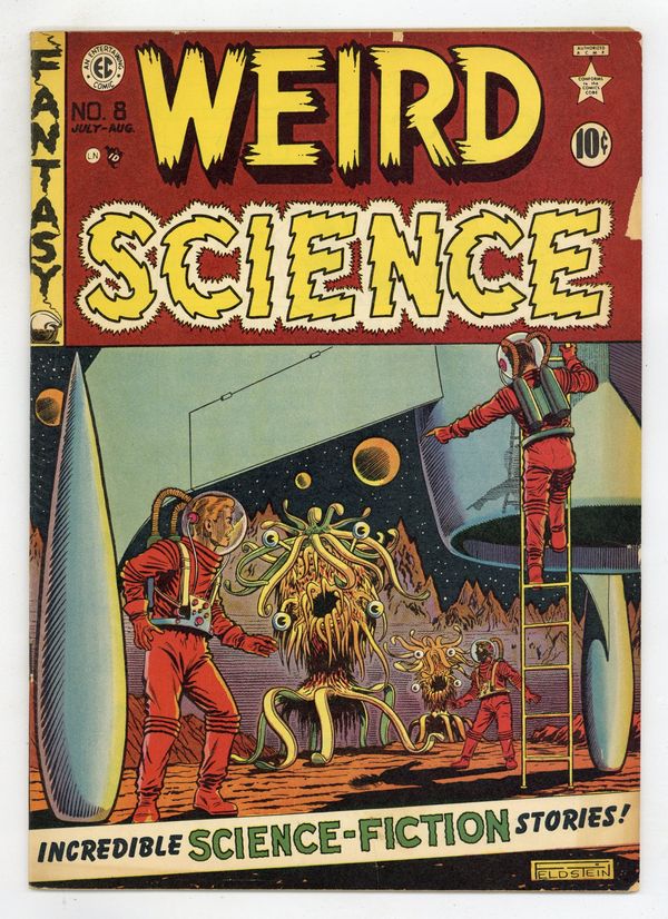 Cover by Al Feldstein. Stories by Bill Gaines and Al Feldstein. Art by George Roussos, Jack Kamen, Wally Wood and Al Feldstein. EC's influential New Trend title featured some legendary sci-fi and comics artists. An astronaut floating in space recalls the murderous events that got him there, in a rare science fiction tale from artist George Roussos, featuring a classic EC twist ending. Explorers from Earth seeking new worlds to colonize discover their crew members mysteriously missing, with art by Wally Wood. Classic Al Feldstein rocket/alien cover. Seeds of Jupiter!; The Escape; Invasion!; Beyond Repair; The Probers. 36 pages, Full Color. Cover price $0.10.
