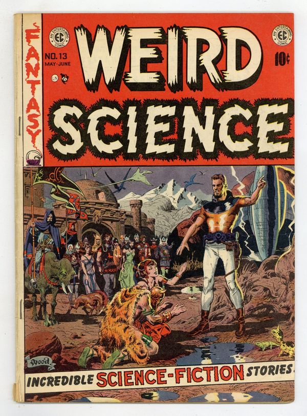 Cover by Wally Wood. Stories by Bill Gaines and Al Feldstein. Art by Jack Kamen, Wally Wood and Joe Orlando. NOTE: There are two issues in this series numbered 13. The one dated May/June 1950 is issue # 2 in the series. The issue pictured here, dated May/June 1952, is the actual # 13 in the series. EC's influential New Trend title featured some legendary sci-fi and comics artists. A scientist and his mistress decide to use a suspended-animation serum so they can be together in the future, but that future is farther away than they think. A space mission is endangered by a stowaway, in a Wally Wood story published before the similar science fiction classic "The Cold Equations." In another Wood story, a stranded space traveler on a primitive planet becomes a messianic figure. Science-fantasy cover by Wally Wood. A Weighty Decision; Saving for the Future; He Walked Among Us; Say Your Prayers. 36 pages, Full Color. Cover price $0.10.