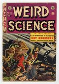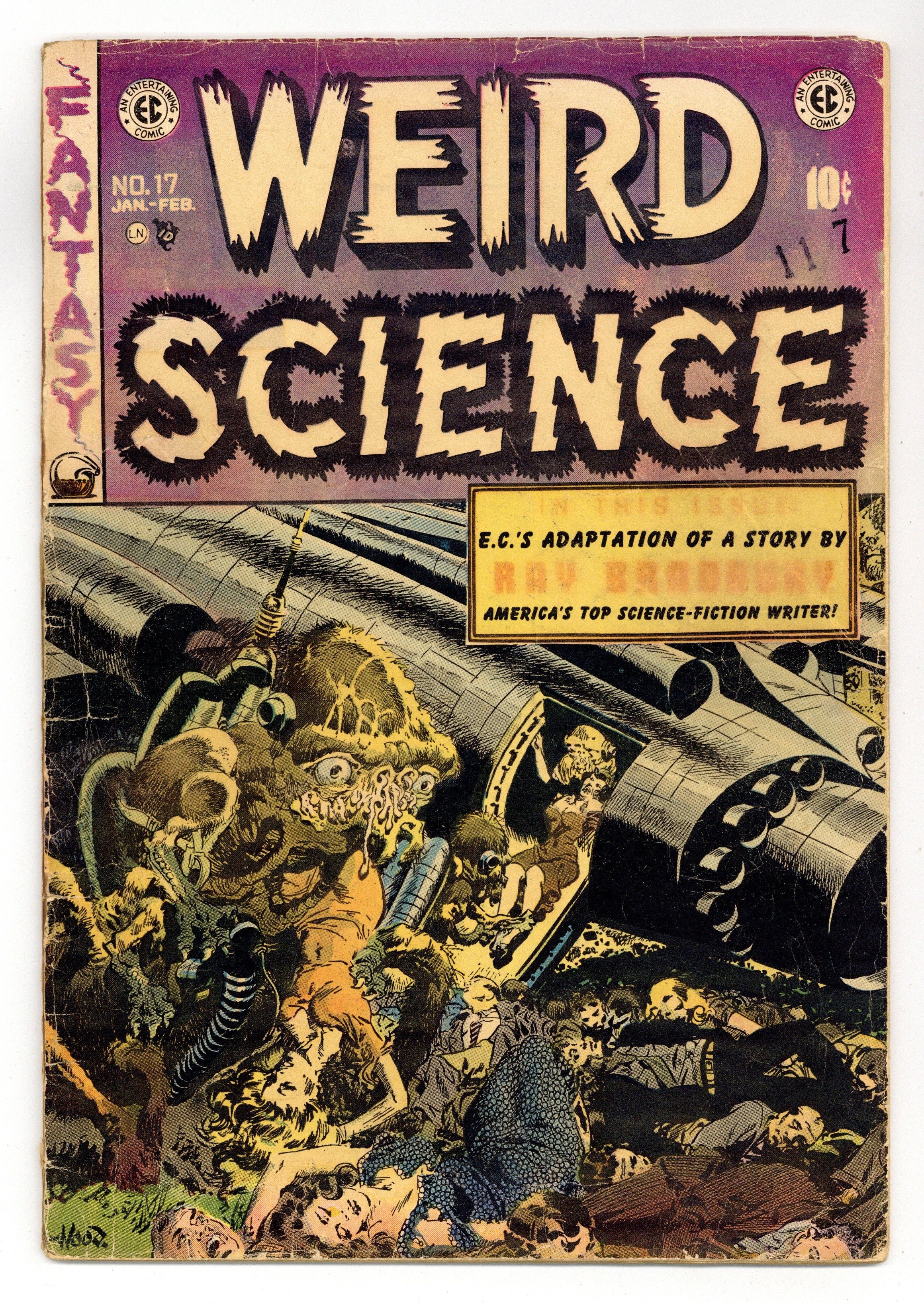 Cover by Wally Wood. Stories by Ray Bradbury, Bill Gaines and Al Feldstein. Art by Wally Wood, Al Williamson, Larry Woromay, Jack Kamen, and Joe Orlando. EC's influential New Trend title featured some legendary sci-fi and comics artists. A lecture from Professor Dingle becomes a strange self-fulfilling prophecy. A Carl Denham-like promoter captures a strange creature on a remote island and brings it back to New York, but its alien cohorts are not amused, with art by Al Williamson. Plus An adaptation of a classic Ray Bradbury Martian story, The Long Years, and a letter from Bradbury himself in the letters column. Classic drooling aliens cover by Wally Wood. Plucked!; The Island Monster; Cargo of the Hesperus; Off Day!; The Long Years! 36 pages, Full Color. Cover price $0.10.