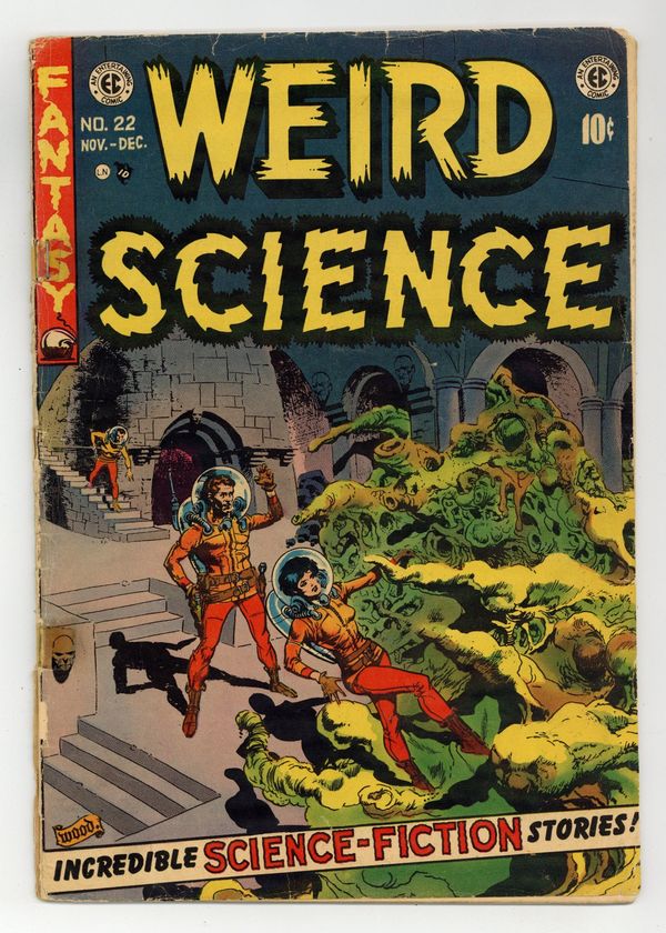 Final issue of the series (becomes Weird Science-Fantasy). "A New Beginning" (art by Al Williamson, with assistance from Frank Frazetta, Roy Krenkel, and Bernard Krigstein), "The Headhunters" (art by George Evans), "My World" (the classic story by Wally Wood), and "Outcast of the Stars" (adapted from the story by Ray Bradbury; art by Joe Orlando). Wood cover. 36 pages, full color. Cover price $0.10.