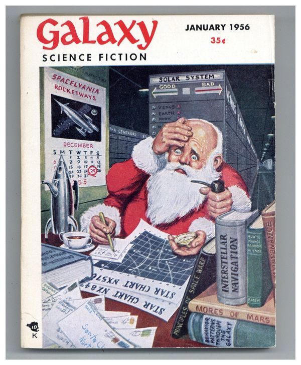Published Jan 1956 by Galaxy Publications.$10.00Volume 11, Issue 3 - January 1956. Cover by Emsh. "Brightside Crossing" by Alan E. Nourse, "The Gravity Business" by James E. Gunn, "The Dwindling Years" by Lester Del Rey, "Junior" by Robert Abernathy, and "The Body" by Robert Sheckley. 5 1/4-in. x 7 1/2-in. 144 Pages, B&W. Cover price $0.35.