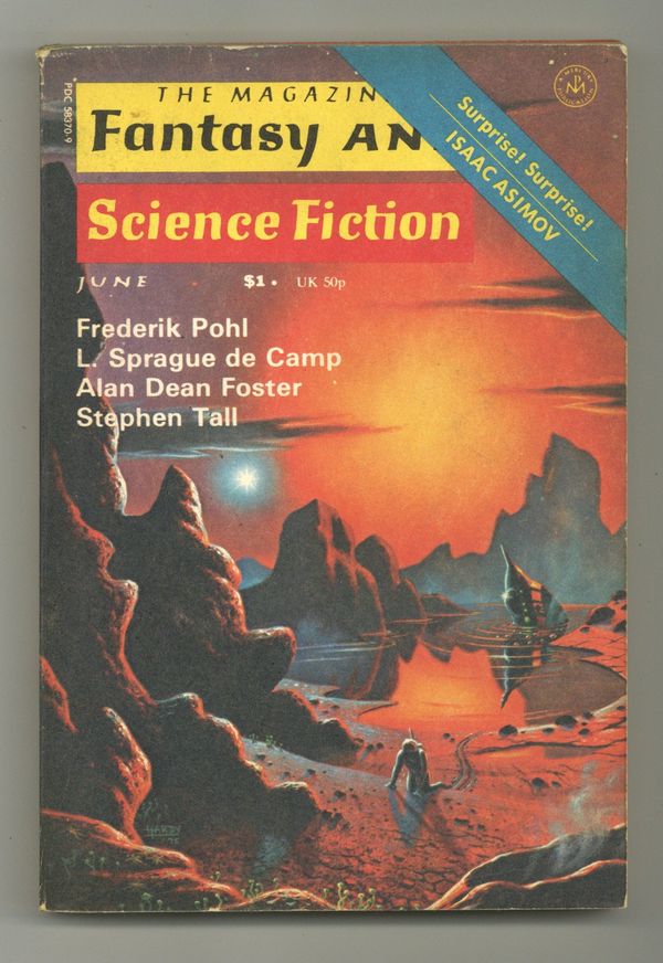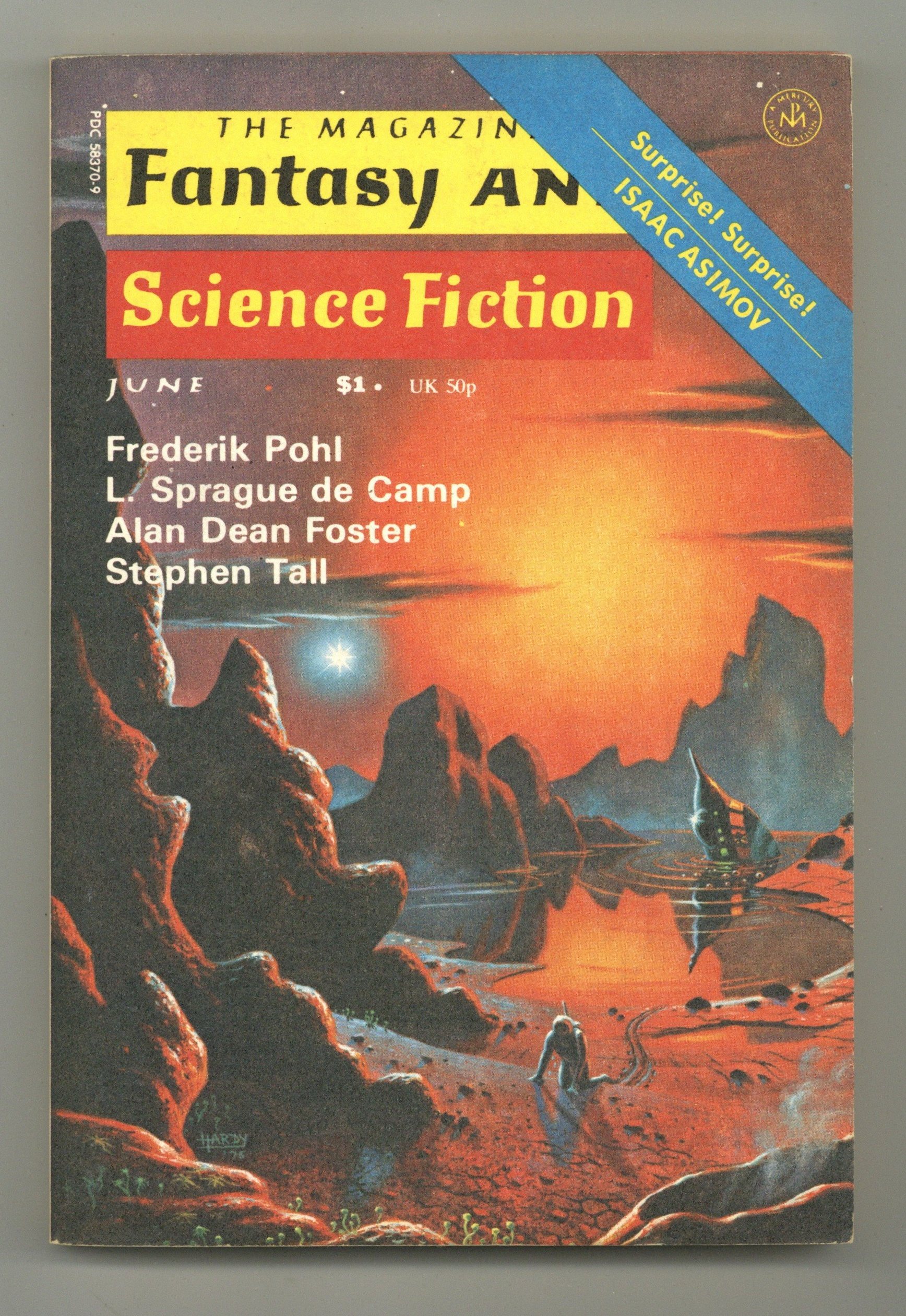 Volume 50, Issue 6 - June 1976. Cover by David Hardy. Fantasy and science fiction stories by Frederick Pohl, Stephen Tall, Robert F. Young, Alan Dean Foster, C.L. Grant, L. Sprague De Camp, and cartoons by the incomparable Gahan Wilson. 5 1/2-in. x 7 1/2-in., 162 pages, B&W Cover price $1.00.