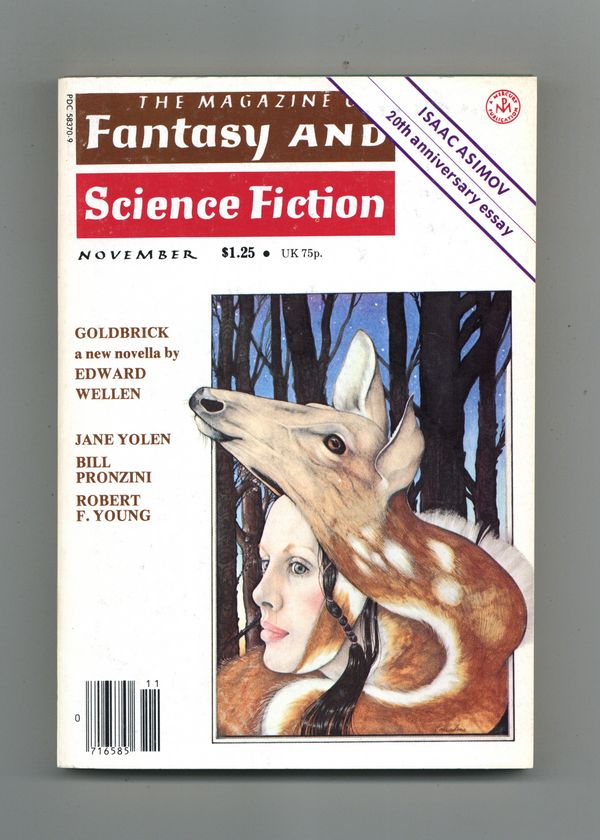 Volume 55, Issue 5 - November 1978. Cover by David Palladini. Fantasy and science fiction stories by Edward Wellen, M. Mendelsohn, Jane Yolen, Robert F. Young, Bill Pronzini, Charles V. De Vet, and Shinichi Hoshi. 5 1/2-in. x 7 1/2-in., 162 pages, B&W Cover price $1.25.