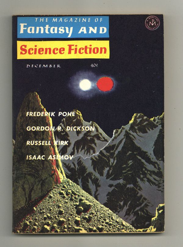 Published Dec 1962 by Mercury Publications.$15.00Volume 23 Issue 6 - December 1962. Cover by Chelsey Bonestell. Fantasy and Science fiction stories by Jim Harmon, Grendel Briarton, Russell Kirk, Felix Marti-Ibanez, Isaac Asimov, Frederik Pohl, Avram Davidson, Sasha Gilien, Gordon R. Dickson, and Henri Damonti. Softcover, 5-in. x 7-in., 130 pages, B&W. Cover price $0.40.