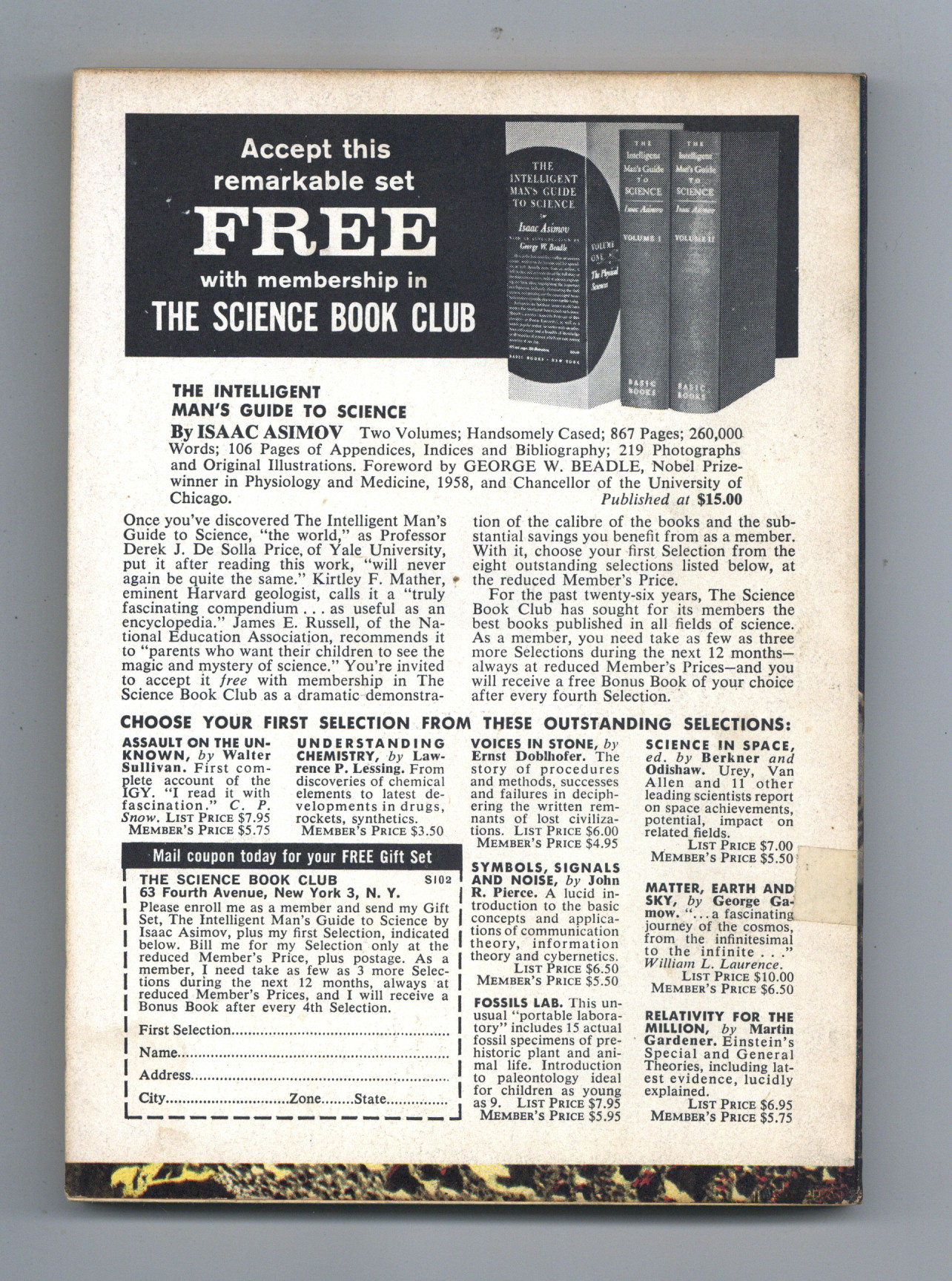 Volume 23 Issue 6 - December 1962. Cover by Chelsey Bonestell. Fantasy and Science fiction stories by Jim Harmon, Grendel Briarton, Russell Kirk, Felix Marti-Ibanez, Isaac Asimov, Frederik Pohl, Avram Davidson, Sasha Gilien, Gordon R. Dickson, and Henri Damonti. Softcover, 5-in. x 7-in., 130 pages, B&W. Cover price $0.40.