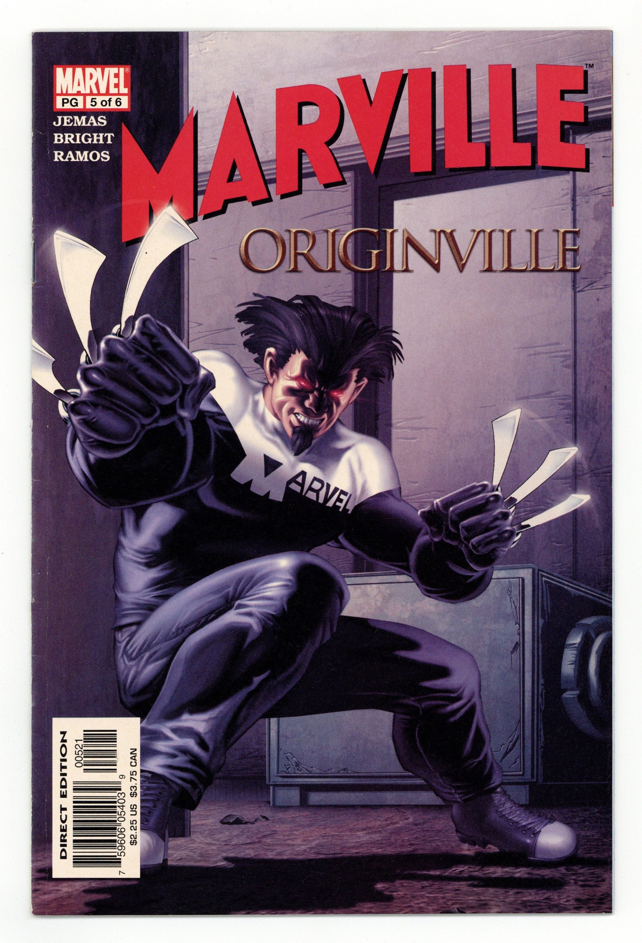 In honor of ORIGINVILLE, Mark Bright delivers a Variant Cover in homage to the cover of ORIGIN #1! Written by Bill Jemas. Art by Mark Bright and Rodney Ramos. Cover by Mark Bright. Here it is, the origin of Wolverine -- the version that Joe Quesada wouldn't let Jemas tell! Kal and his pals meet the first human being, Wolverine. They fast-forward through various stages of primal man and witness as politics and religion become a factor in the human experience. Jack explains the true nature of God to his companions. Characters in this issue: Kal-AOL; Lucy; Mickey; Jack; Wolverine. 32 pages, full color. Marvel PG Cover price $2.25.