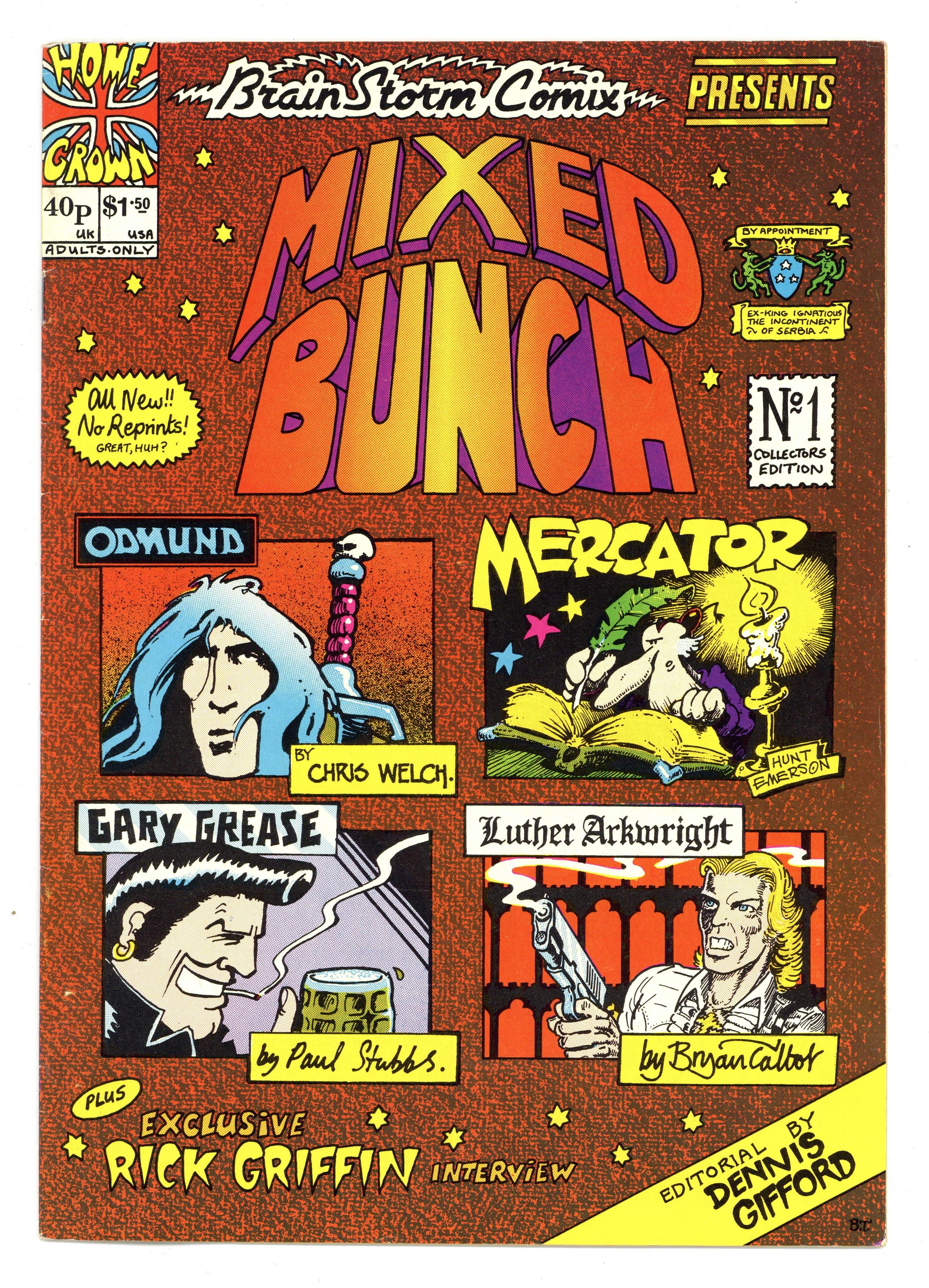 1st (only) printing. Vol 1 No. 3 (Mixed Bunch #1 cover title). Cover by Bryan Talbot. English underground comic magazine. "Mixed Bunch" of comics and stories by Bryan Talbot, Hunt Emerson, Mal Burns, Paul Stubbs and more! 8.25-in x 11.75-in. 34 pages, B&W. Mature readers. Cover price $1.50.