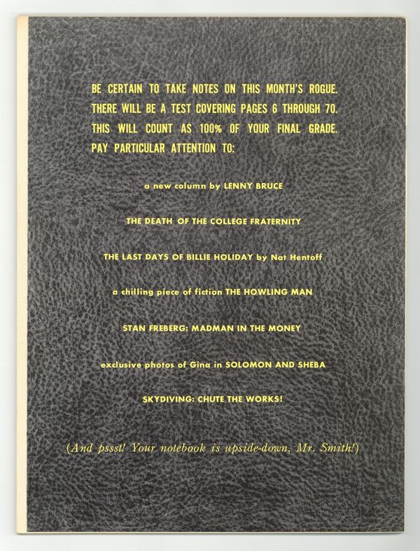 General men's interest magazine. This issue: College issue. Includes a column by Lenny Bruce, The Last Days of Billie Holiday, skydiving and more. 8.25-in. x 10.75-in. 82 pages, PC/PB&W. Mature readers. Cover price $0.50.
