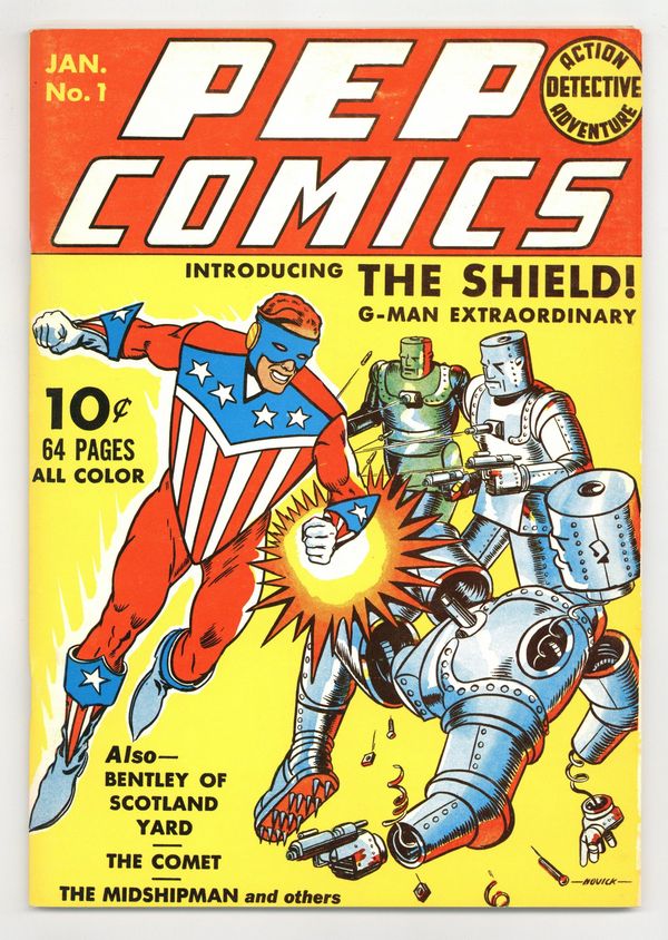 The seventh issue of the Flashback reprint series presents Pep Comics # 1 originally published in 1940 by National Periodical Publications. With the SHIELD. Also appearing the COMET by Jack Cole, THE FALCOLN and 5 more. 68-pages, full color cardstock covers, 7-3/4-in. x 10-3/8-in. black-and-white interior on white paper stock, saddle-stitched binding. Cover price $3.00.