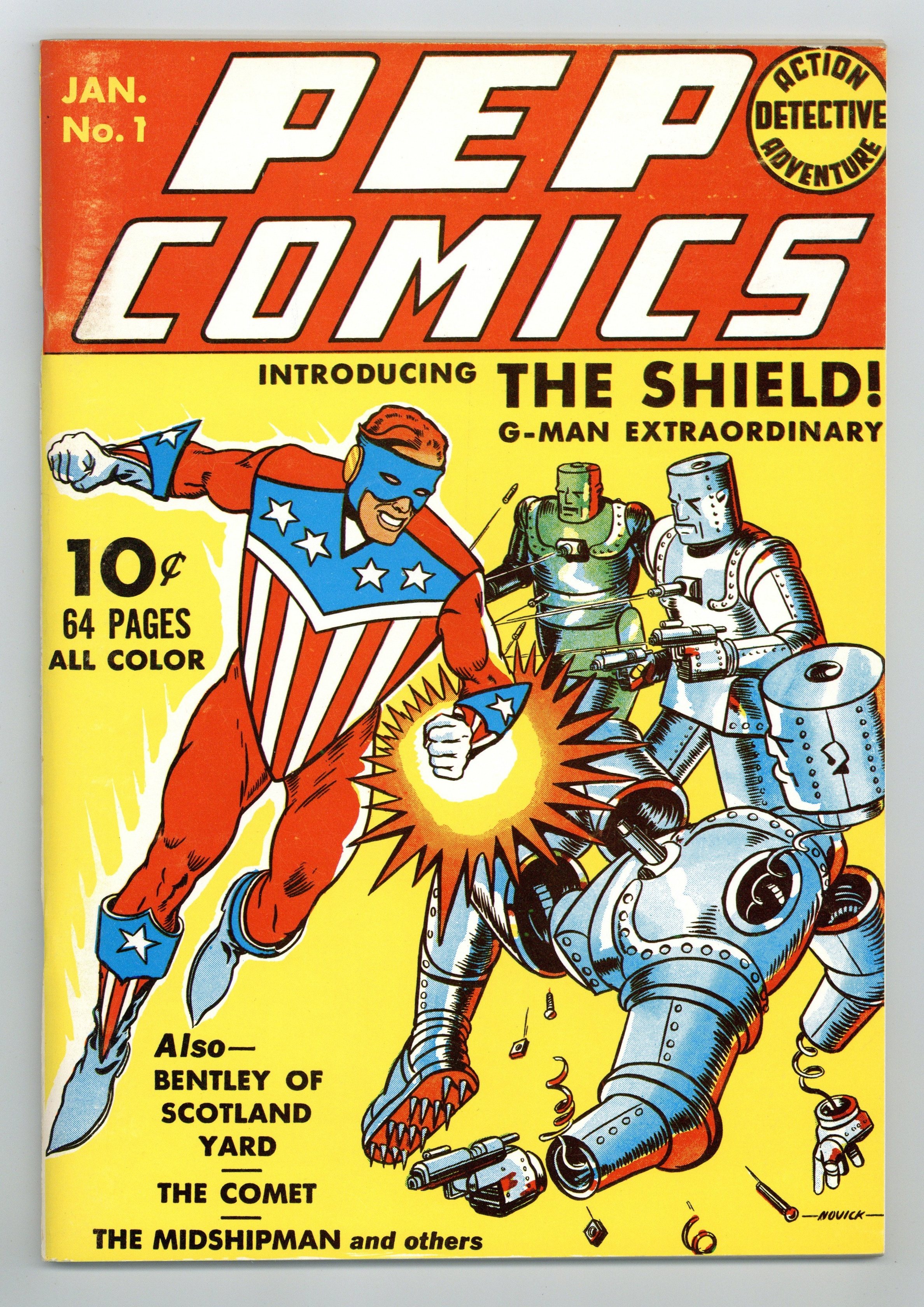 Starts Apr 27 The seventh issue of the Flashback reprint series presents Pep Comics # 1 originally published in 1940 by National Periodical Publications. With the SHIELD. Also appearing the COMET by Jack Cole, THE FALCOLN and 5 more. 68-pages, full color cardstock covers, 7-3/4-in. x 10-3/8-in. black-and-white interior on white paper stock, saddle-stitched binding. Cover price $3.00.