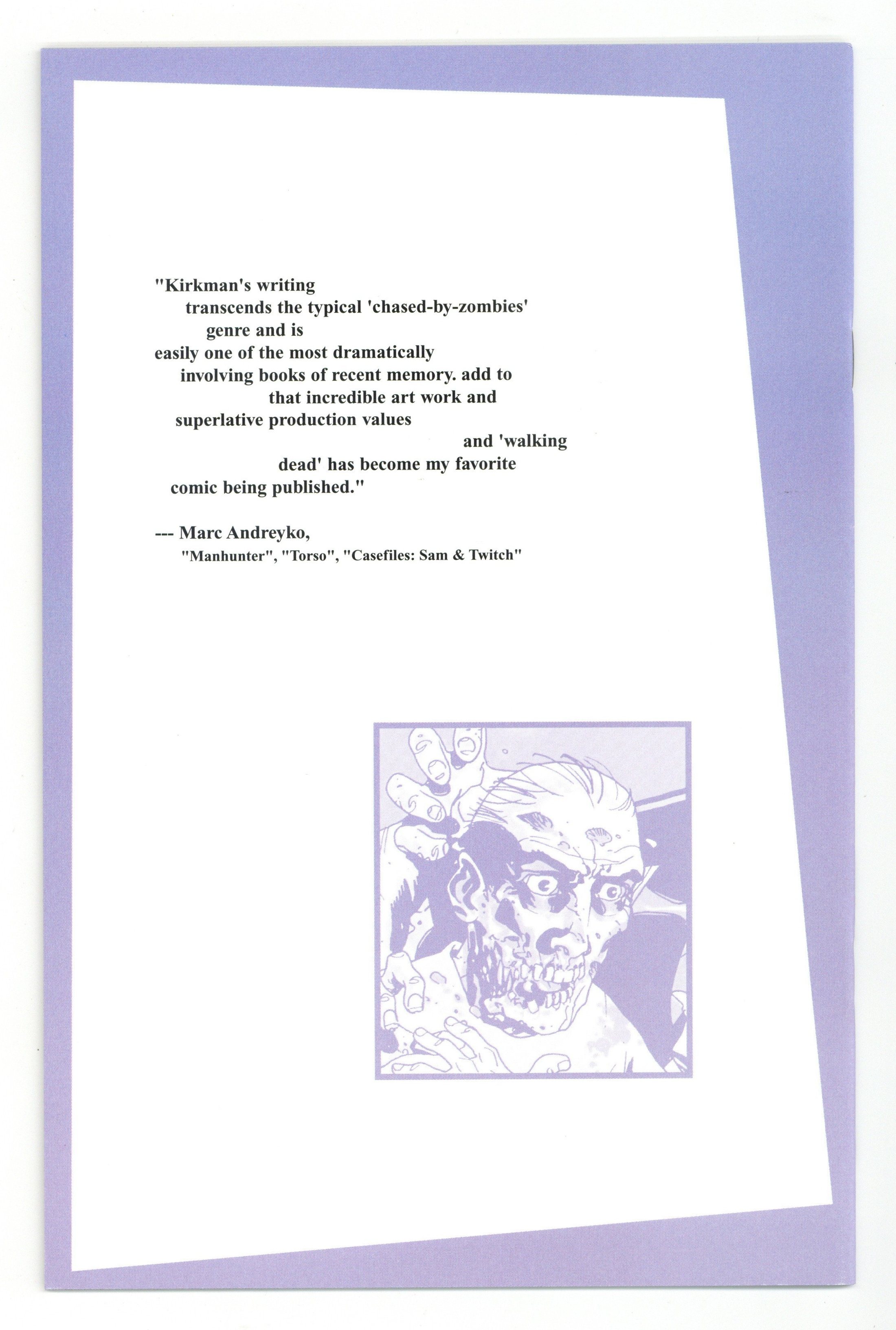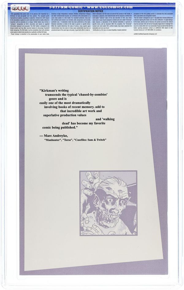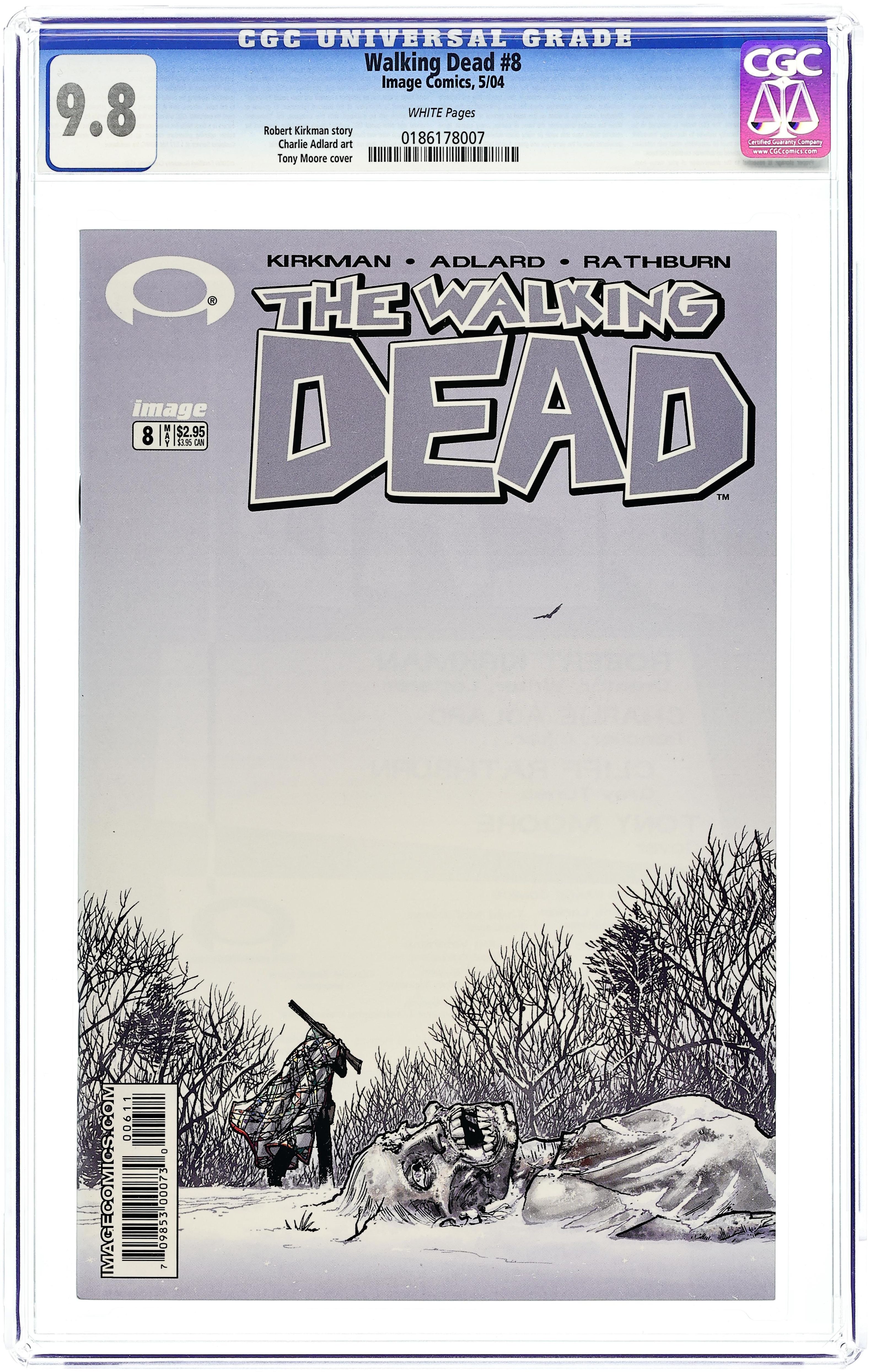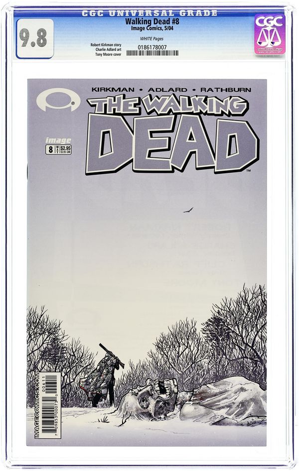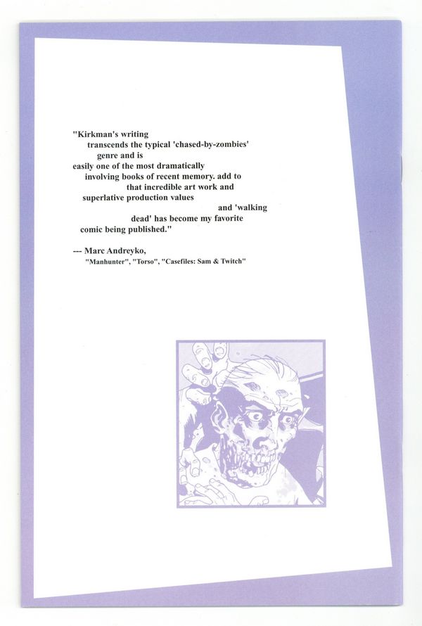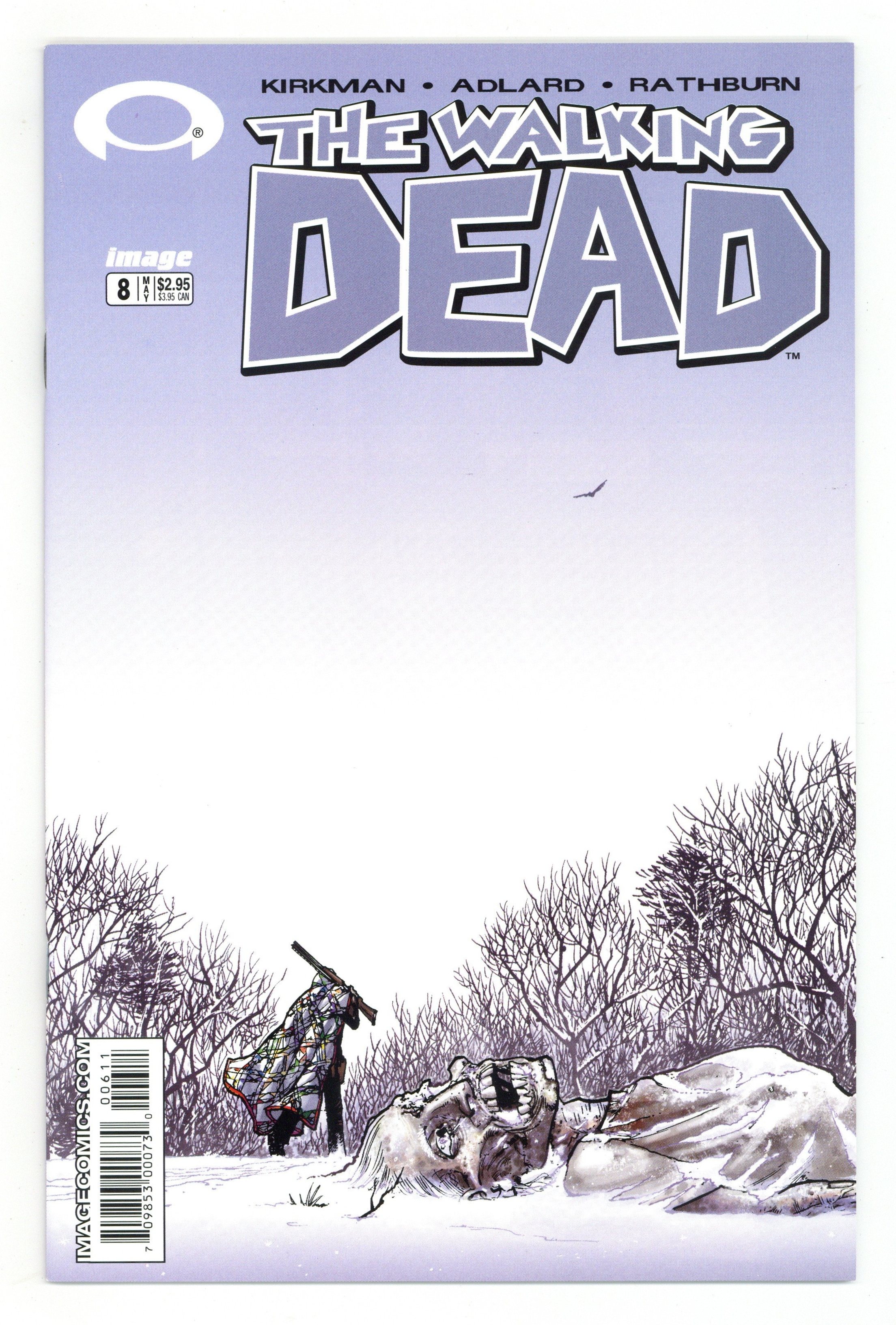 1ST PRINTING (2nd printing exists). (W) Robert Kirkman (P) Charlie Adlard (Cover) Tony Moore; The search for suitable shelter continues. Rick and crew find themselves at the mercy of a harsh winter that makes their arduous journy that much more difficult. For months they've looked for something to take their minds OFF the zombie threat at hand... and now that they;ve got it; they're in more danger than ever before. Cover price $2.95.