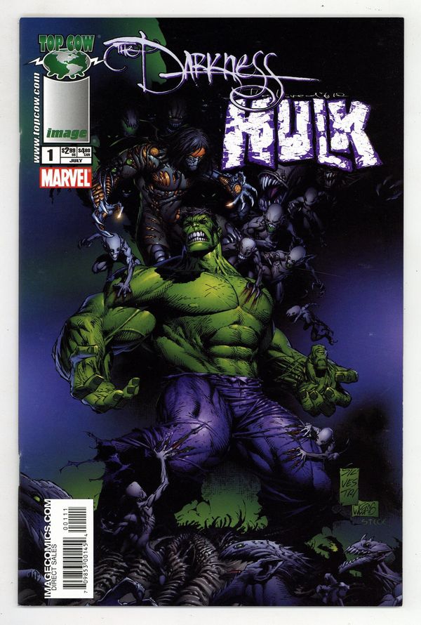 Tags: HulkPublished Jul 2004 by Top Cow/Marvel.$16.00Marc Silvestri Retailer Incentive Variant cover: 1 in 10 ratio. (W) Paul Jenkins (P) Dale Keown (C) Matt Milla Two alumni of both The Darkness and The Hulk come together to tell this explosive story. The Darkness is a violent killer and the Hulk is a violent pacifist. When those two worlds collide who will remain standing? Can the Darkness stand in the face of the Hulk's brute strength? Cover by Dale Keown! FC, 32pg $2.99 One shot Cover price $2.99.