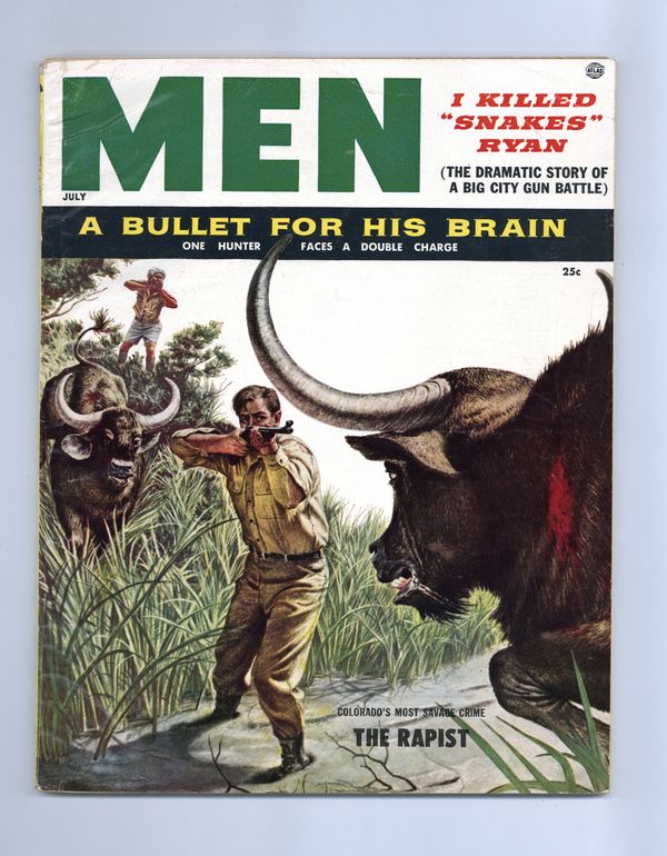 Volume 4, Issue 7 - July 1955. Cover by Robert Doares. Men's magazine featuring articles on hunting, fitness, politics, true crime, and buxom beauties. 8 1/2-in. x 11-in. 100 pages B&W. Cover price $0.25.
