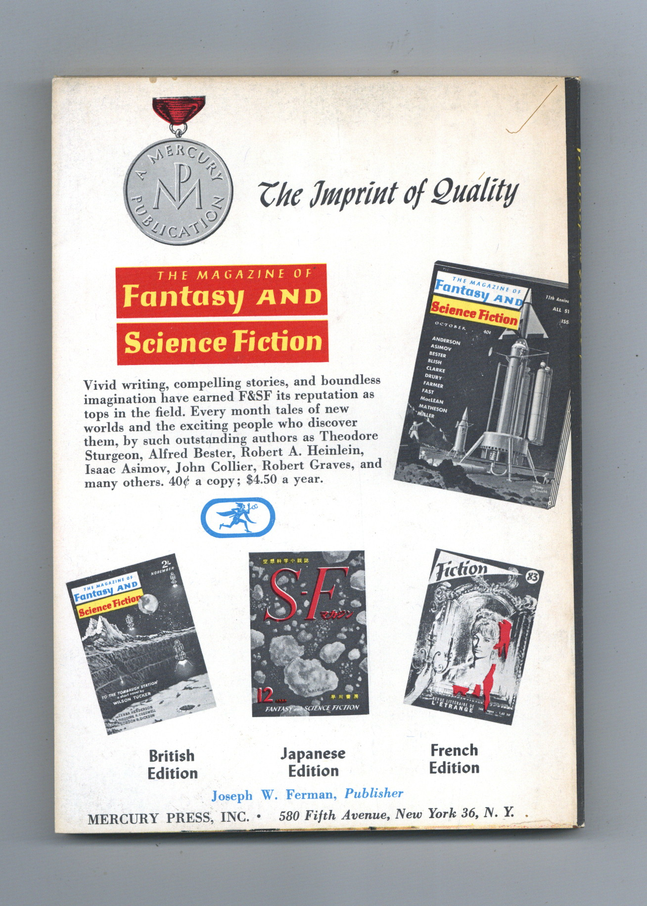 Published Jan 1962 by Mercury Publications.$15.00Volume 22, Issue 1 - January 1962. Cover by Mel Hunter. Fantasy and science fiction stories by James White, Grendel Briarton, Kate Wilhelm, Jay Williams, Maria Russell, Ron Goulart and Isaac Asimov. Softcover, 5 1/2-in. x 7 1/2-in., 128 pages, B&W. Cover price $0.40.