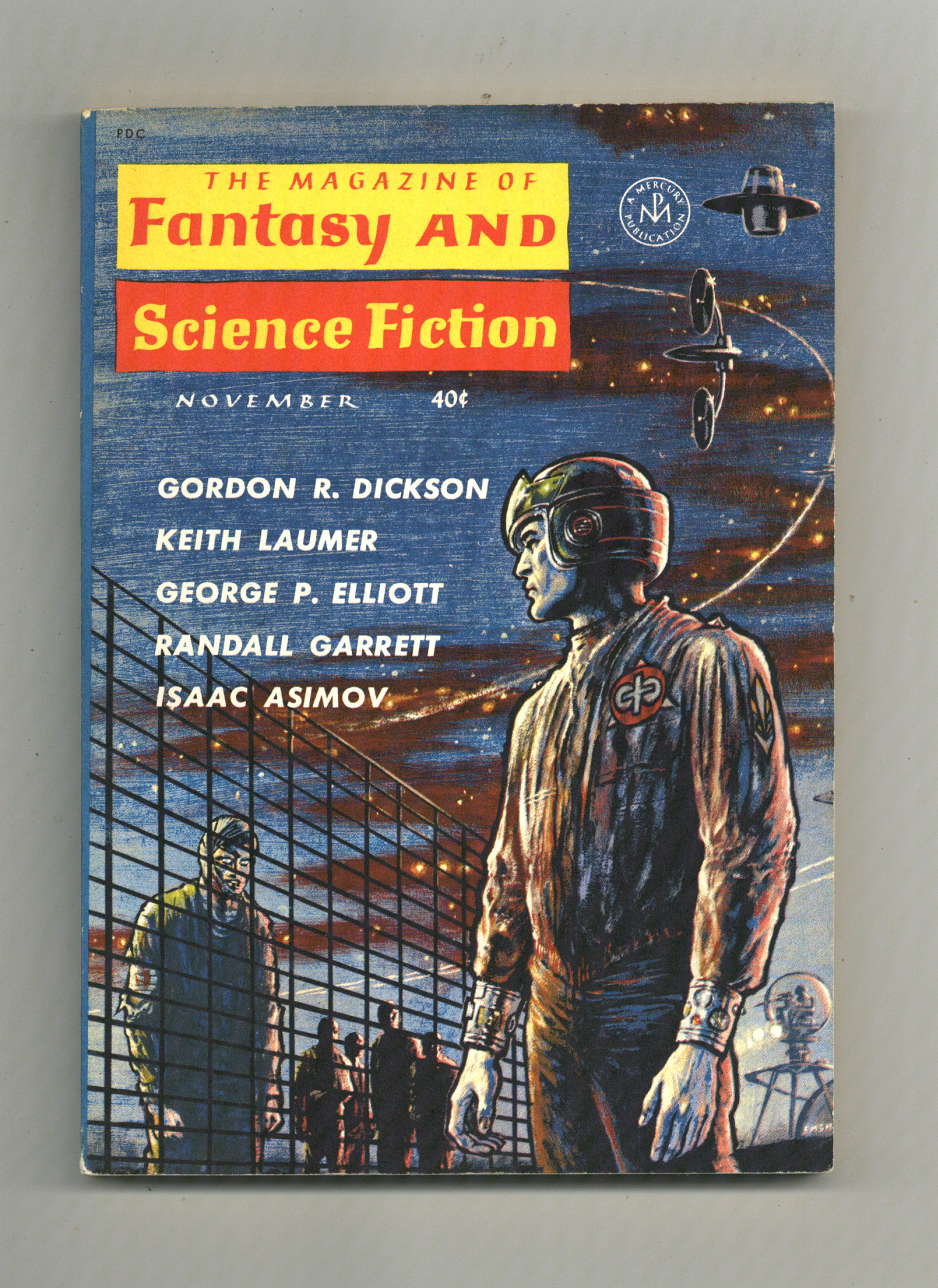 Published Nov 1961 by Mercury Publications.$32.00Volume 21, Issue 5 - November 1961. Cover by Emsh. Fantasy and science fiction stories by Keith Laumer, Walter Tevis, Rivk Rubin, George P. Elliot, Grendel Briarton, Doris Pitkin Buck, Alice Glaser, Randall Garrett, and Isaac Asimov. Softcover, 5 1/2-in. x 7 1/2-in.; 130 pages, B&W. Cover price $0.40.