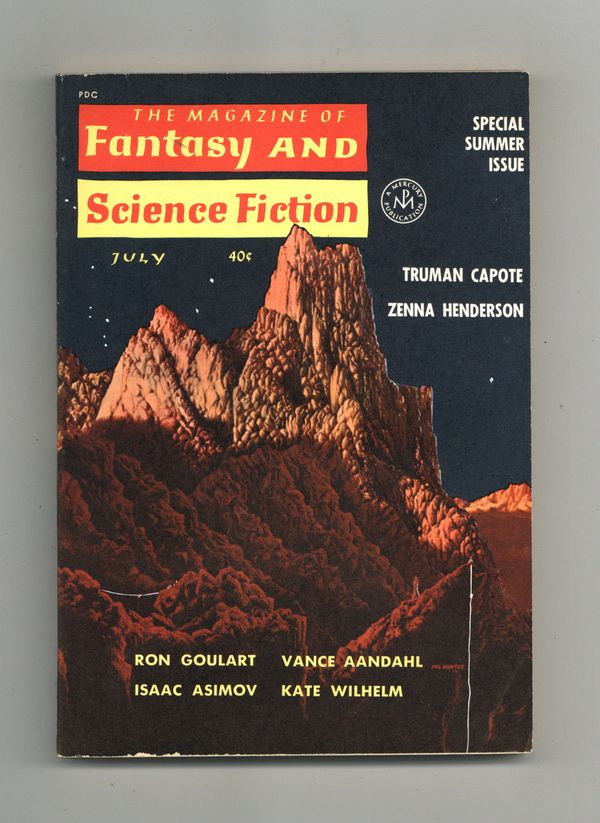 Volume 23, Issue 1 - July 1962. Cover by Mel Hunter. Fantasy and Science Fiction Stories by Vance Aandahl, Sasha Gilien, Truman Capote, Carl Brandon, Zenna Henderson, Terry Carr, Karen Anderson, Joanna Russ, and Isaac Asimov. 5 1/2-in. x 7 1/2-in., 130 pages, Text. Cover price $0.40.
