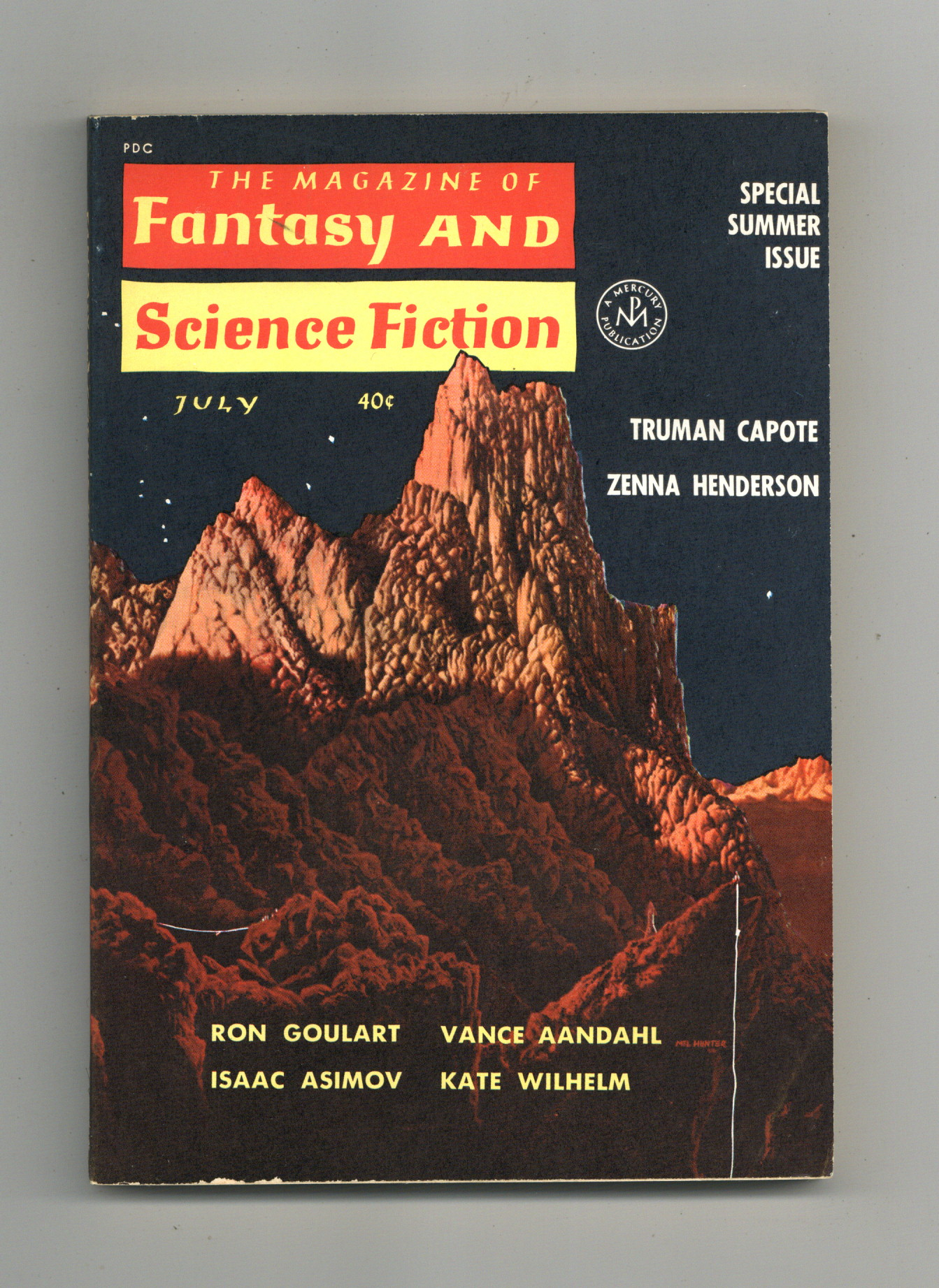 Published Jul 1962 by Mercury Publications.$7.60Volume 23, Issue 1 - July 1962. Cover by Mel Hunter. Fantasy and Science Fiction Stories by Vance Aandahl, Sasha Gilien, Truman Capote, Carl Brandon, Zenna Henderson, Terry Carr, Karen Anderson, Joanna Russ, and Isaac Asimov. 5 1/2-in. x 7 1/2-in., 130 pages, Text. Cover price $0.40.