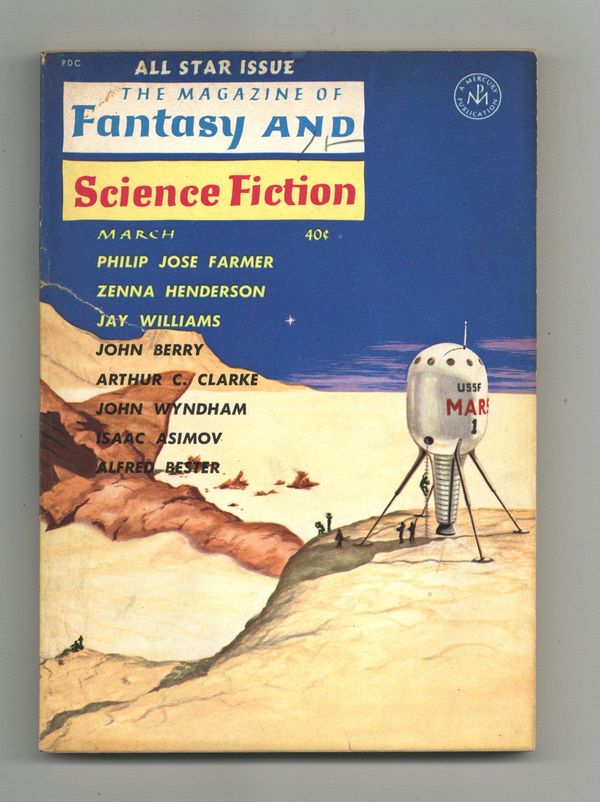 Published Mar 1961 by Mercury Publications.$3.00Volume 20, Issue 3 - March 1961. Cover by Mel Hunter. Fantasy and science fiction stories by Zenna Henderson, Jay Williams, Arthur C. Clarke, John Wyndham, Isaac Asimov, Alfred Bester, Philip Jose Farmer, Grendel Briarton, and John Berry. Softcover, 5 1/2-in. x 7 1/2-in., 128 pages, B&W. Cover price $0.40.