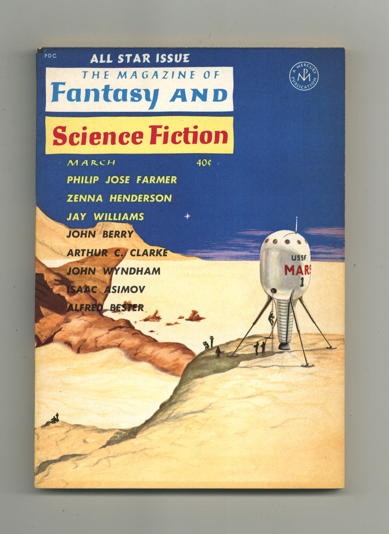 Published Mar 1961 by Mercury Publications.$32.00Volume 20, Issue 3 - March 1961. Cover by Mel Hunter. Fantasy and science fiction stories by Zenna Henderson, Jay Williams, Arthur C. Clarke, John Wyndham, Isaac Asimov, Alfred Bester, Philip Jose Farmer, Grendel Briarton, and John Berry. Softcover, 5 1/2-in. x 7 1/2-in., 128 pages, B&W. Cover price $0.40.