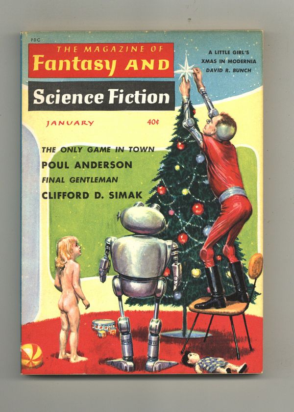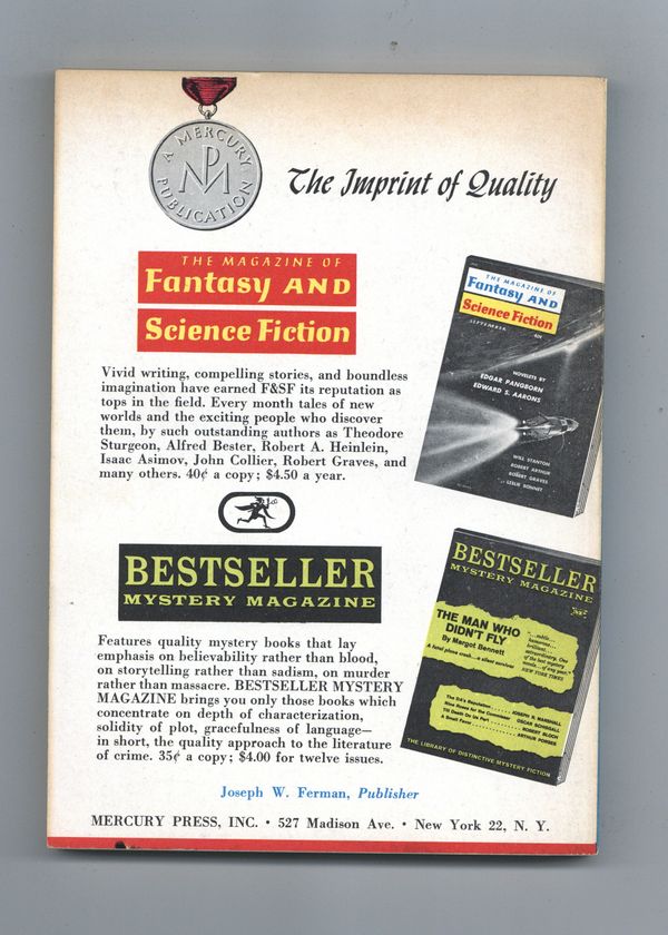 Published Jan 1960 by Mercury Publications.$36.00Volume 18, Issue 1 - January 1960. Cover by Emsh. Fantasy and science fiction stories by Poul Anderson, Niall Wilde, Anthony Brode, Charles Henneberg, R. Bretnor, Isaac Asimov, and Damon Knight. Softcover, 5 1/2-in. x 7 1/2-in., 128 pages, B&W. Cover price $0.40.