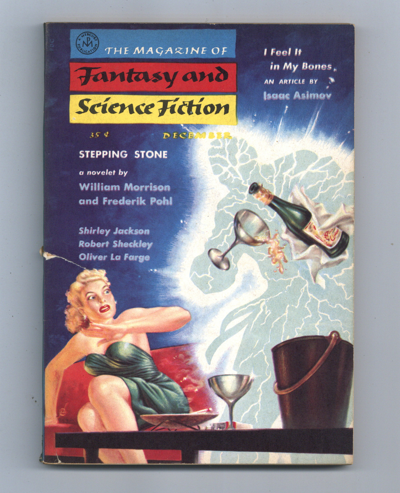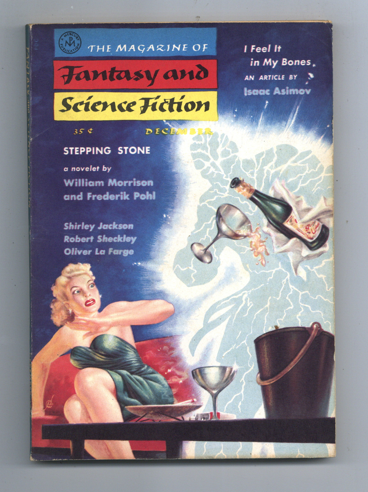 Published Dec 1957 by Mercury Publications.$3.60Volume 13, Issue 6 - December 1957. Cover by Kelly Freas. Science fiction and fantasy stories by Isaac Asimov, Leah Bodine Drake, Shirley Jackson, Robert Sheckley, Charles Beaumont and G.C. Edmondson. Softcover, 5 1/2-in., x 7 1/2-in., 130 pages, Text (with B&W illustrations) Cover price $0.35.