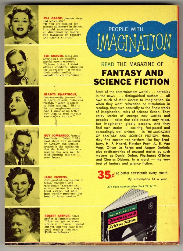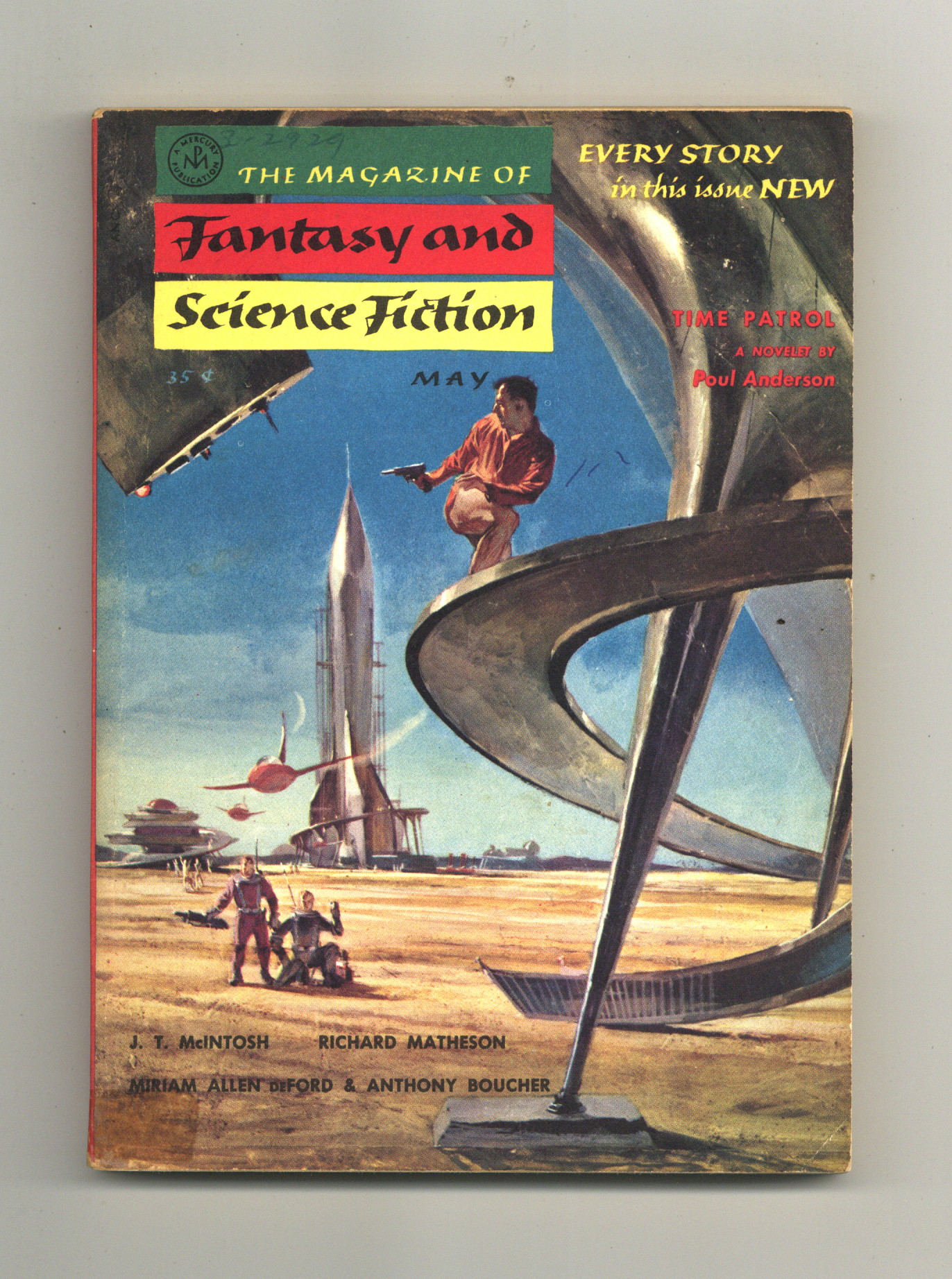 Published May 1955 by Mercury Publications.$7.20Volume 8, Issue 5 - May 1955. Cover by Stanley Meltzoff. Fantasy and Science Fiction stories by Poul Anderson, P.M. Hubbard, James Blish, Charles Beaumont, Gordon R. Dickson, Richard Matheson, J.T. McIntosh, Rodger Lowe, John Novotny, Frederic Brown, Miriam Allen Deford and Anthony Boucher. Softcover, 5.5-in. x 7.5-in.; 128 newsprint pages, Text. Cover price $0.35.