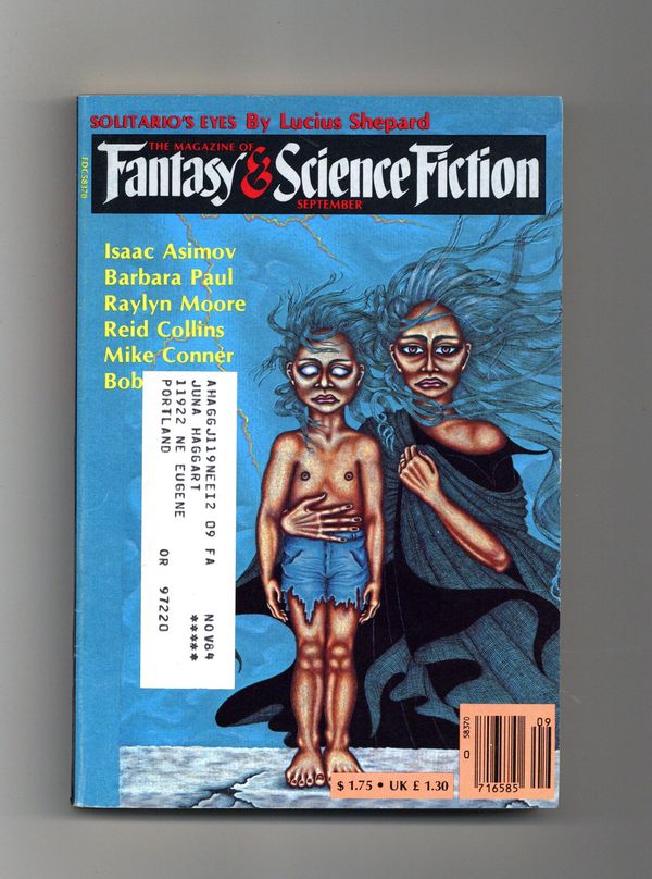 Published Sep 1983 by Mercury Publications.$2.65Volume 65, Issue 3 - September 1983. Cover by R.J. Krupowicz. Fantasy and Science Fiction stories by Bob Leman, Mike Conner, Barbara Paul, Terry Brykczynski, Raylyn Moore, Reid Collins, Tony Richards and Lucius Shepard. Science article by Isaac Asimov. Softcover. 5-in. x 7-in., 162 pages, text (with B&W illustrations). Cover price $1.75.