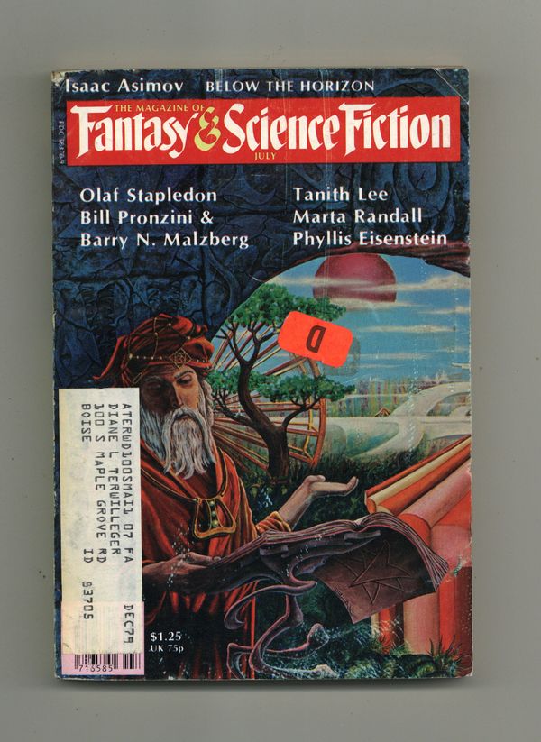 Published Jul 1979 by Mercury Publications.$2.65Volume 57, Issue 1 - July 1979. Cover by Barclay Shaw. Fantasy and science fiction stories by Phyllis Eisenstein, Bill Pronzini, Barry N. Malzberg, Tanith Lee, Grania Davis, Marta Randall, Herbie Brennan, Felix C. Gotschalk and Olaf Stapledon. Science article by Isaac Asimov. 5-in. x 7-in., 162 pages, Text (with B&W illustrations). Cover price $1.25.