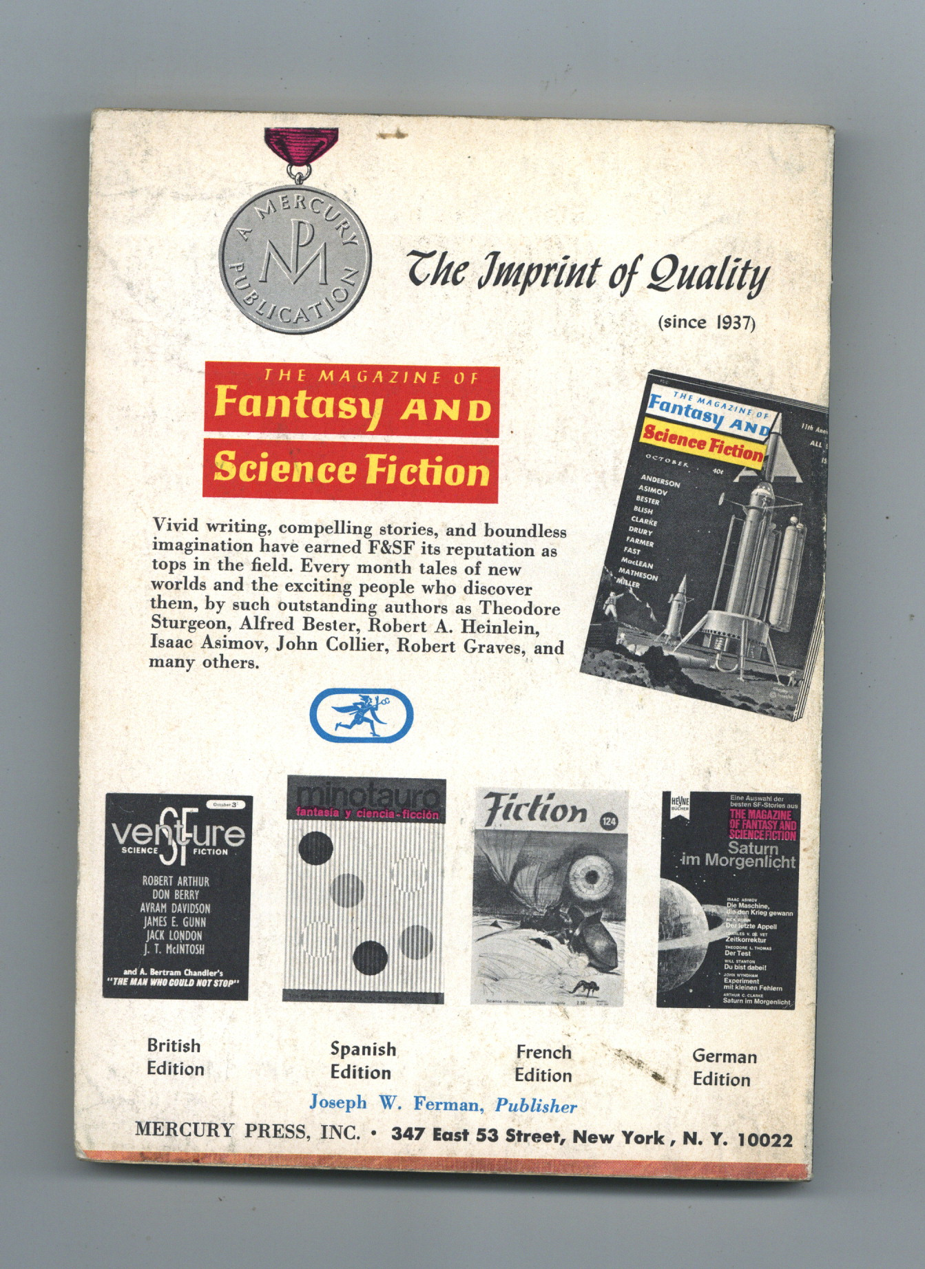 Published Jul 1965 by Mercury Publications.$7.60Volume 29, Issue 1 - July 1965. Cover by Jack Gaughan. Fantasy and science fiction stories by Poul Anderson, Frederic Brown, Carl Onspaugh, Ron Goulart, Theodore L. Thomas, Herb Lehrman, Greg Benford, Doris Pitkin Buck, L. Sprague De Camp, Roger Zelazny and Robert Arthur. Science article by Isaac Asimov. Softcover. 5-in. x 7-in., 128 pages, Text (with B&W illustrations). Cover price $0.50.