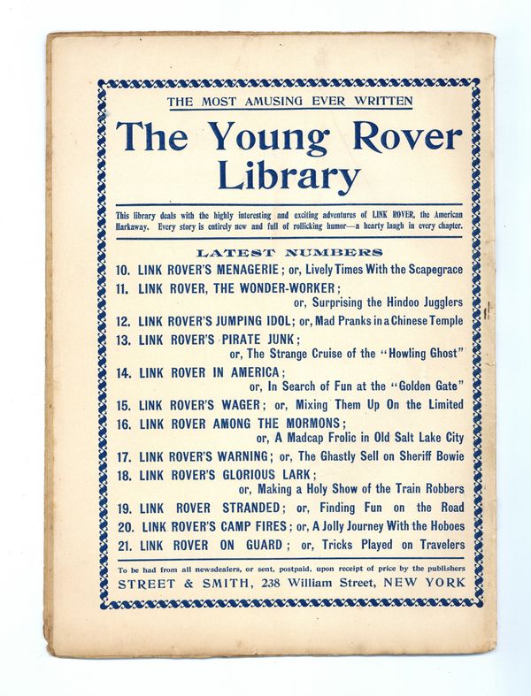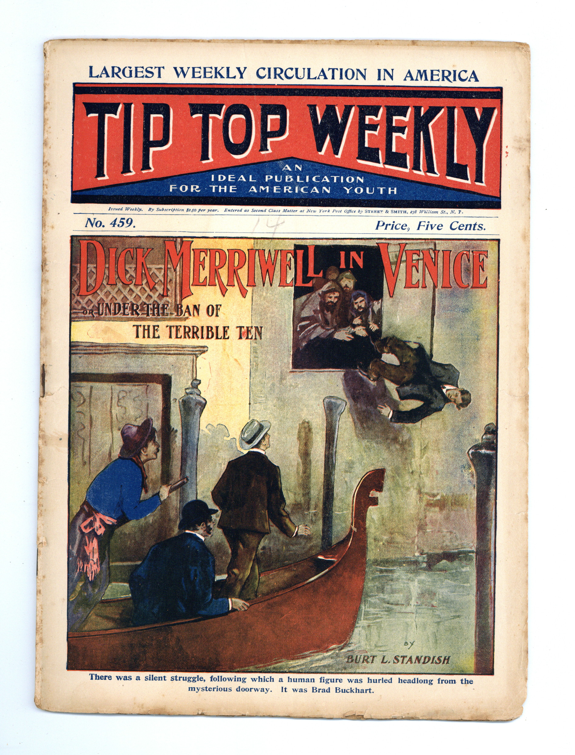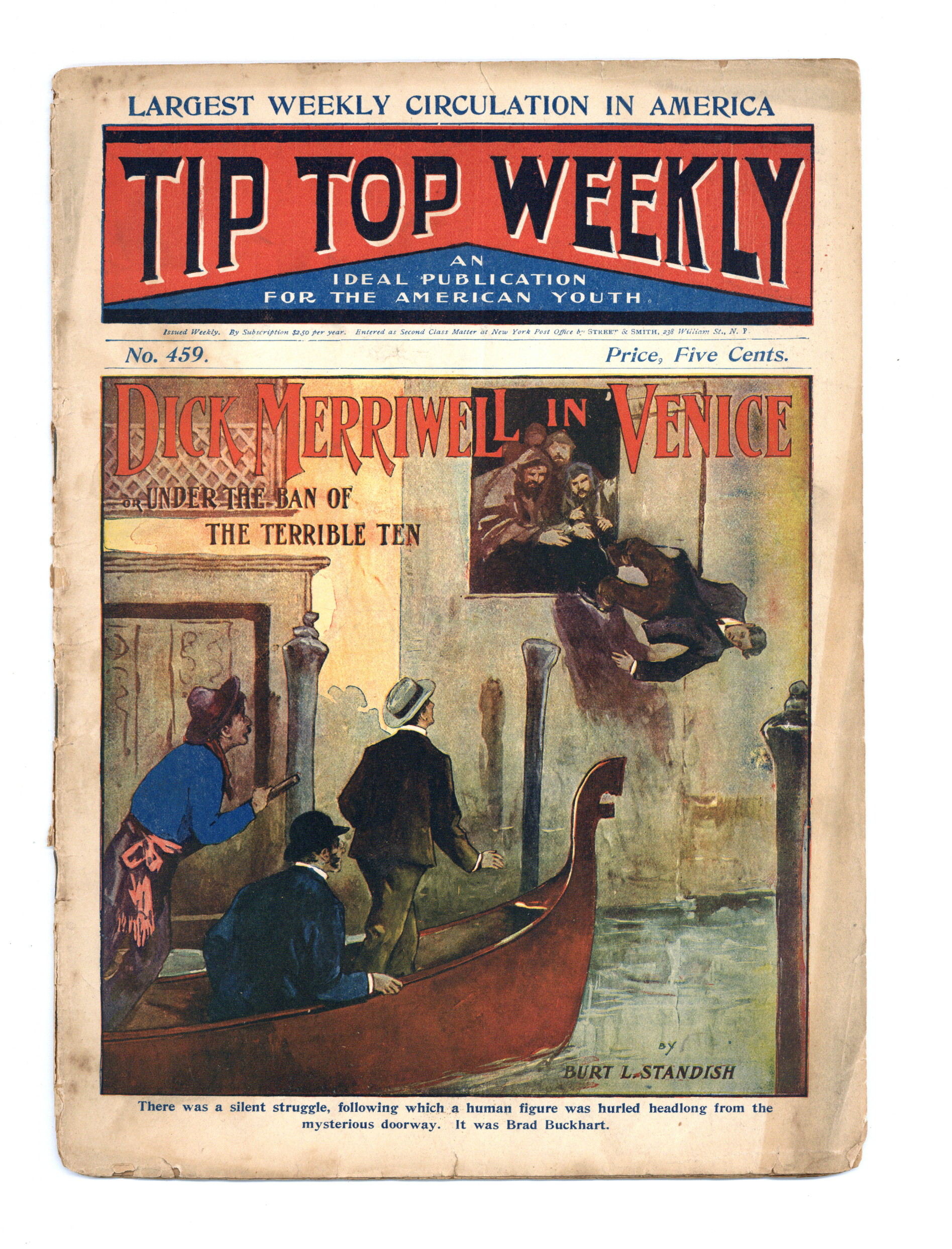 January 28, 1905. Written by Burt L. Standish (Gilbert Patten). Tip Top Weekly was promoted as "An Ideal Publication for American Youth," and was primarily devoted to the continuing adventures of student Frank Merriwell, who started at a fictional New England academy and then went to Yale, eventually becoming an international adventurer. Newsprint. 8.25-in. x 10.5-in. 34 pages, Text. Cover price $0.05.