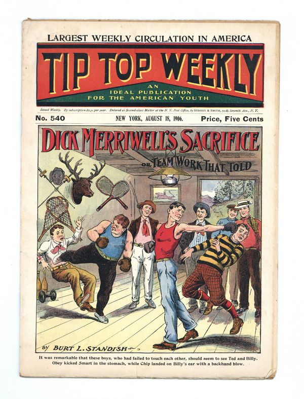 August 18, 1906. Written by Burt L. Standish (Gilbert Patten). Tip Top Weekly was promoted as "An Ideal Publication for American Youth," and was primarily devoted to the continuing adventures of student Frank Merriwell, who started at a fictional New England academy and then went to Yale, eventually becoming an international adventurer. Newsprint. 8.25-in. x 10.5-in. 34 pages, Text. Cover price $0.05.