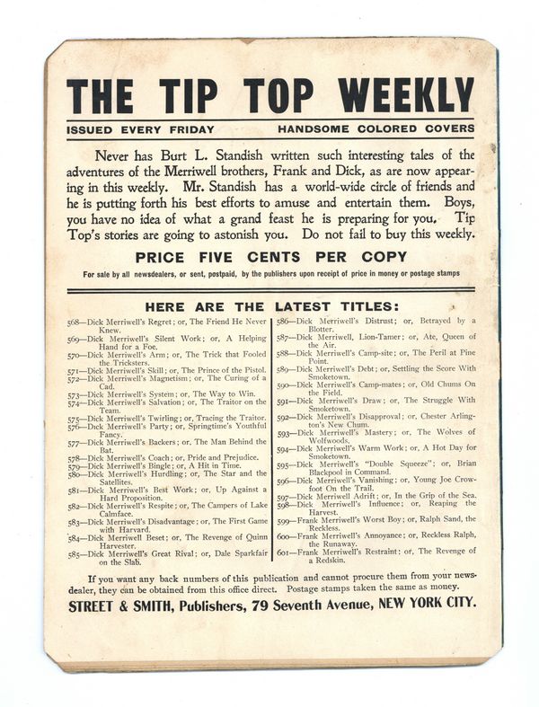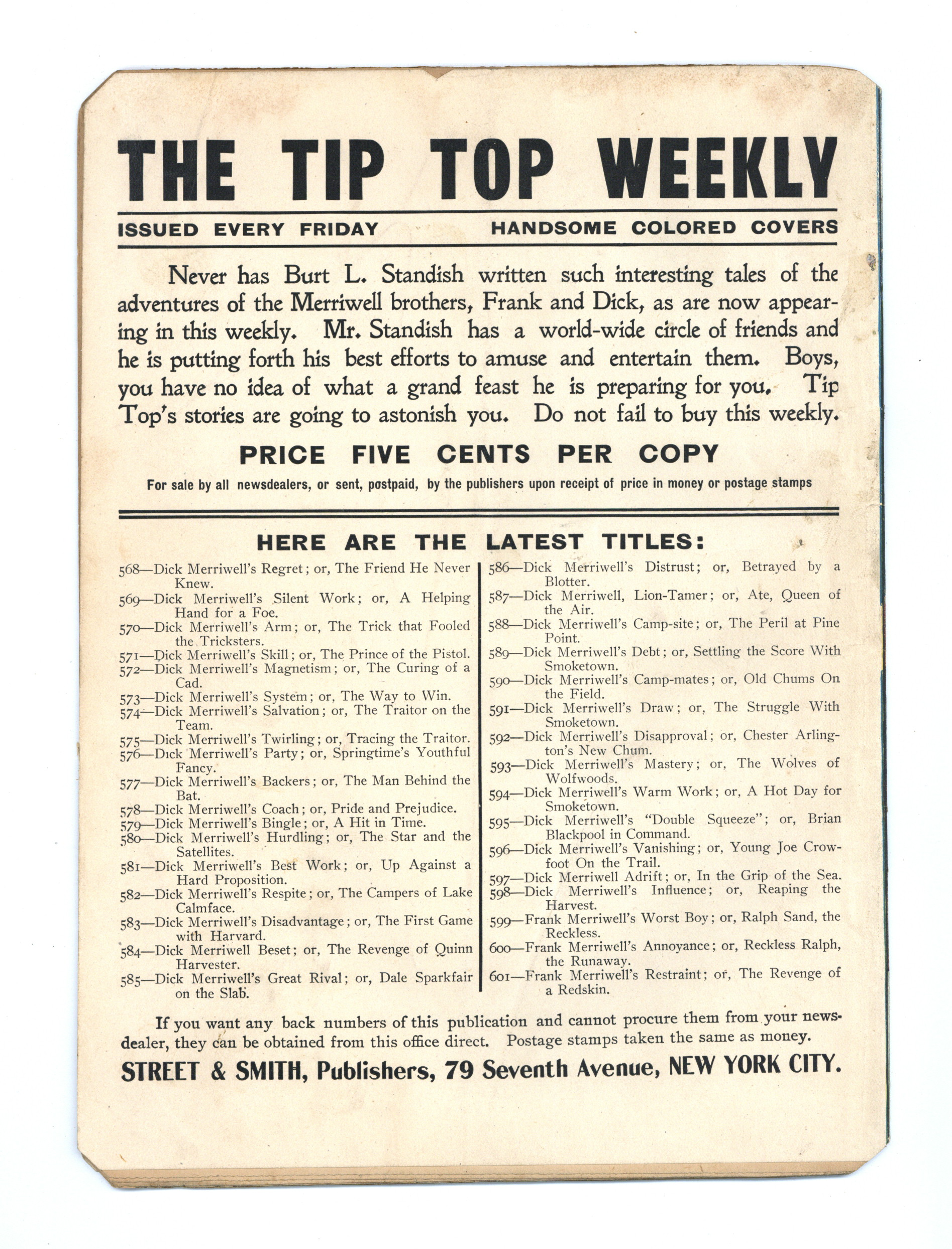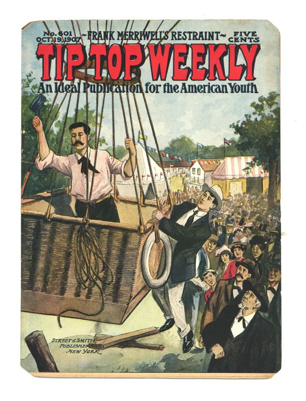 Published Oct 1907 by Street & Smith.$12.50October 19, 1907. Written by Burt L. Standish (Gilbert Patten). Tip Top Weekly was promoted as "An Ideal Publication for American Youth," and was primarily devoted to the continuing adventures of student Frank Merriwell, who started at a fictional New England academy and then went to Yale, eventually becoming an international adventurer. Newsprint. 8.25-in. x 10.5-in. 34 pages, Text. Cover price $0.05.