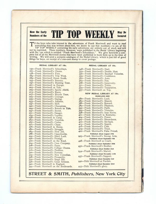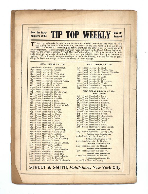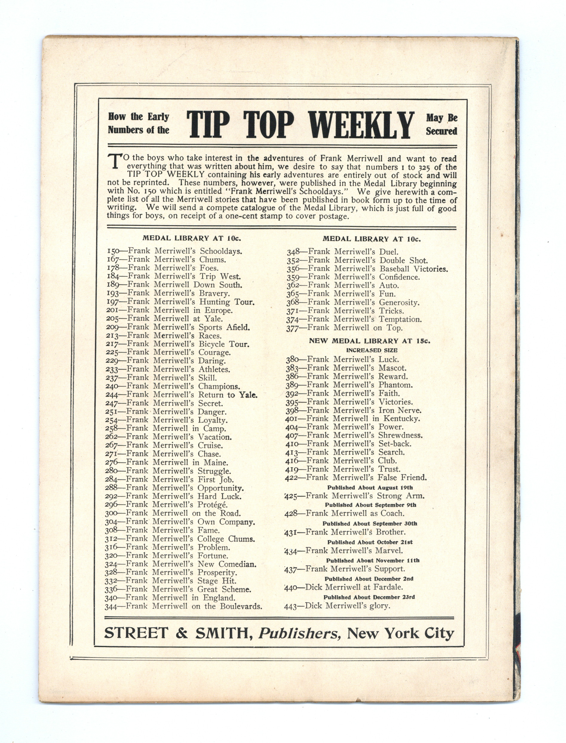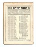 Published Dec 1907 by Street & Smith.$9.00December 21, 1907. Written by Burt L. Standish (Gilbert Patten). Tip Top Weekly was promoted as "An Ideal Publication for American Youth," and was primarily devoted to the continuing adventures of student Frank Merriwell, who started at a fictional New England academy and then went to Yale, eventually becoming an international adventurer. Newsprint. 8.25-in. x 10.5-in. 34 pages, Text. Cover price $0.05.